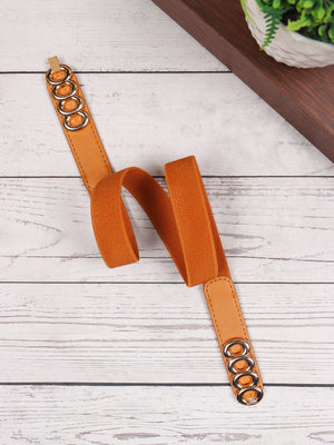 Berrylush Women Solid Brown Golden Embellished PU Nylon Interlock Regular Slim Belt