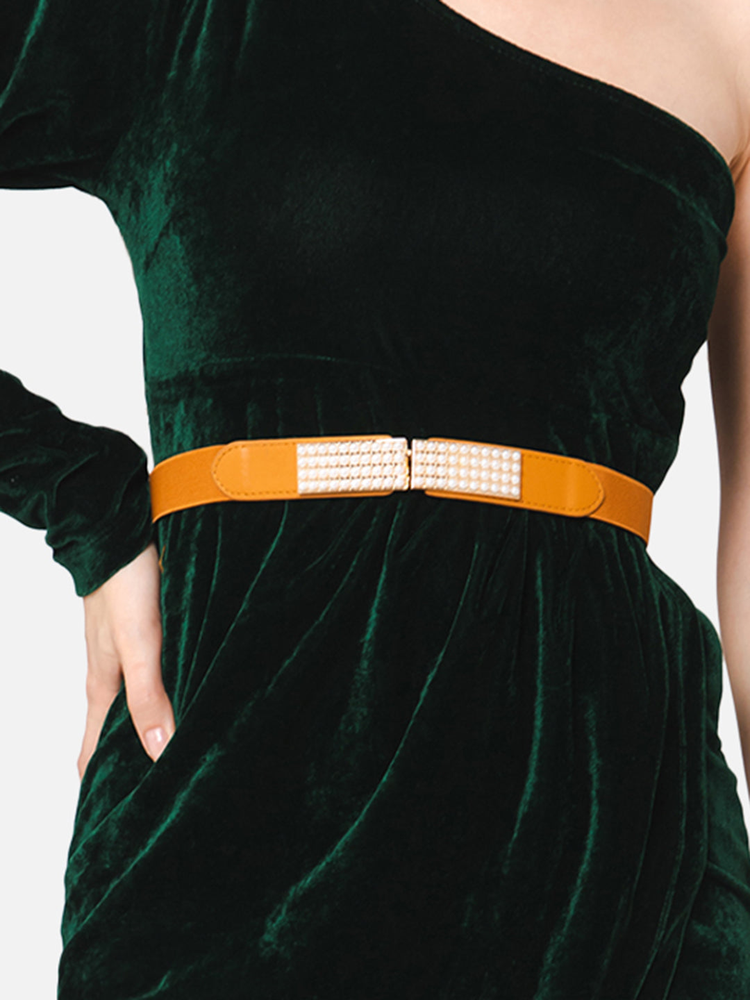 Give your casual closet a trendy and chic makeover by adding to your shopping cart this enchanting Solid Brown Pearl Studded Regular Belt introduced by Berrylush. Adorned with pretty pearl studded surface styling that adds a luxurious charm to this belt for an elegant yet high-toned appearance with a lovely design. The slim width gives this belt a versatile yet voguish fashion statement with easy styling options for jeans, dresses, or trousers. Moreover, the metallic fastener injects eye-catching and engaging detail into this belt with practical utility. Introduce stylish glam to your boring outfit with this belt to create a fashion-forward look for your next outing.
