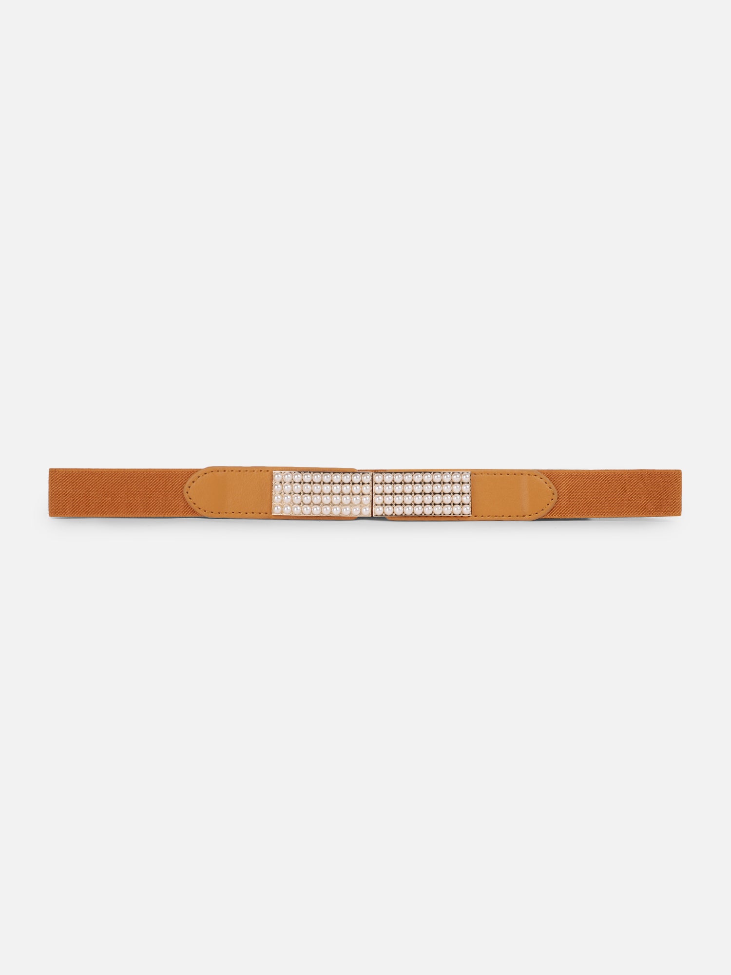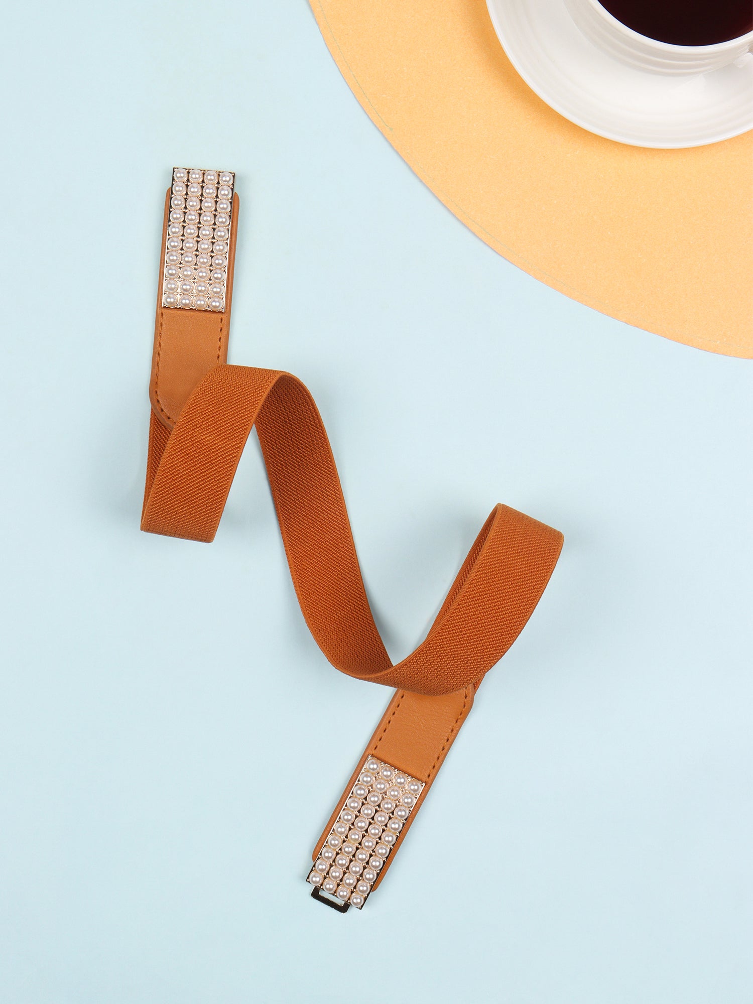 Berrylush Women Solid Brown Pearl Studded PU Nylon Interlock Regular Slim Belt