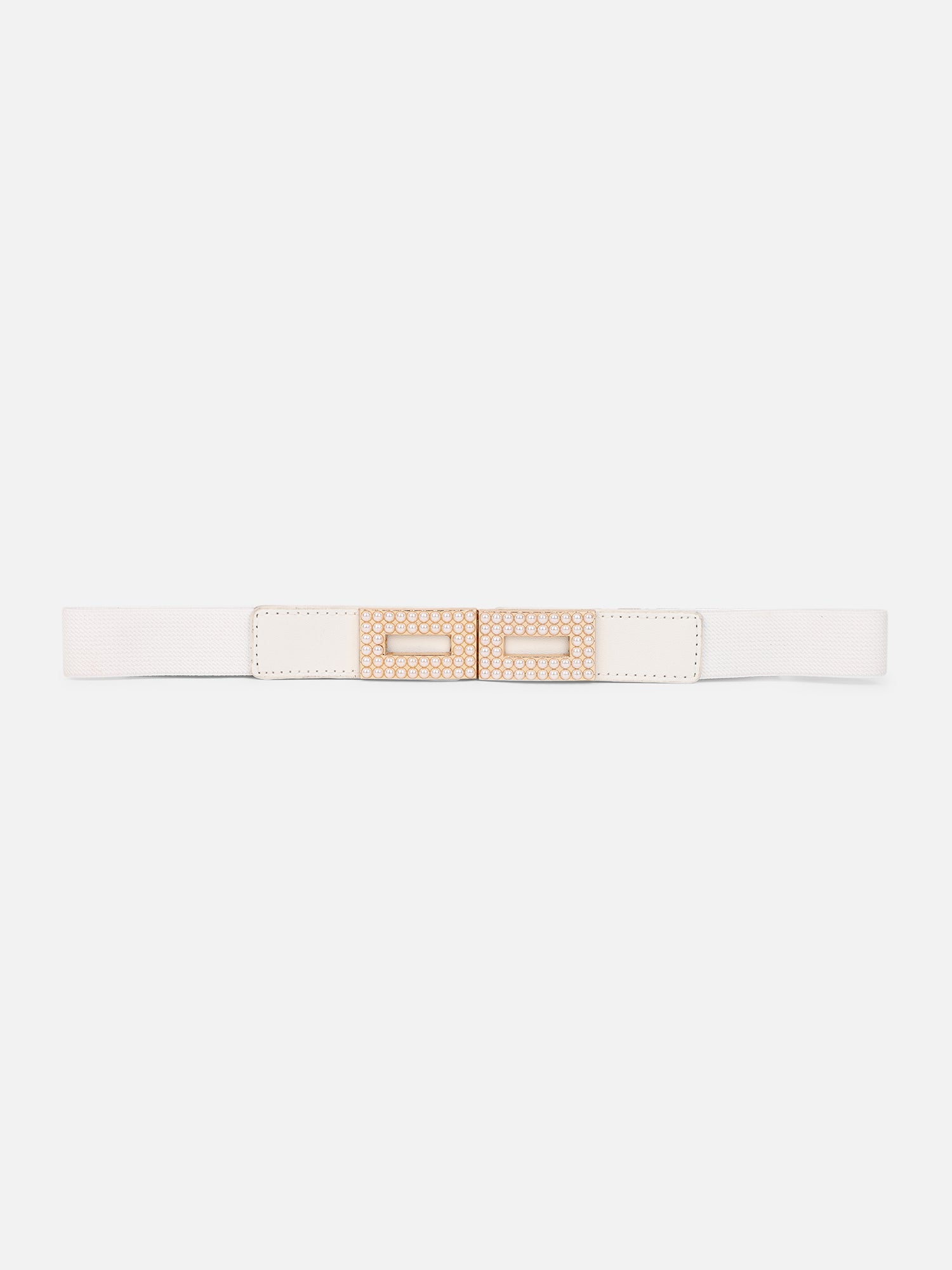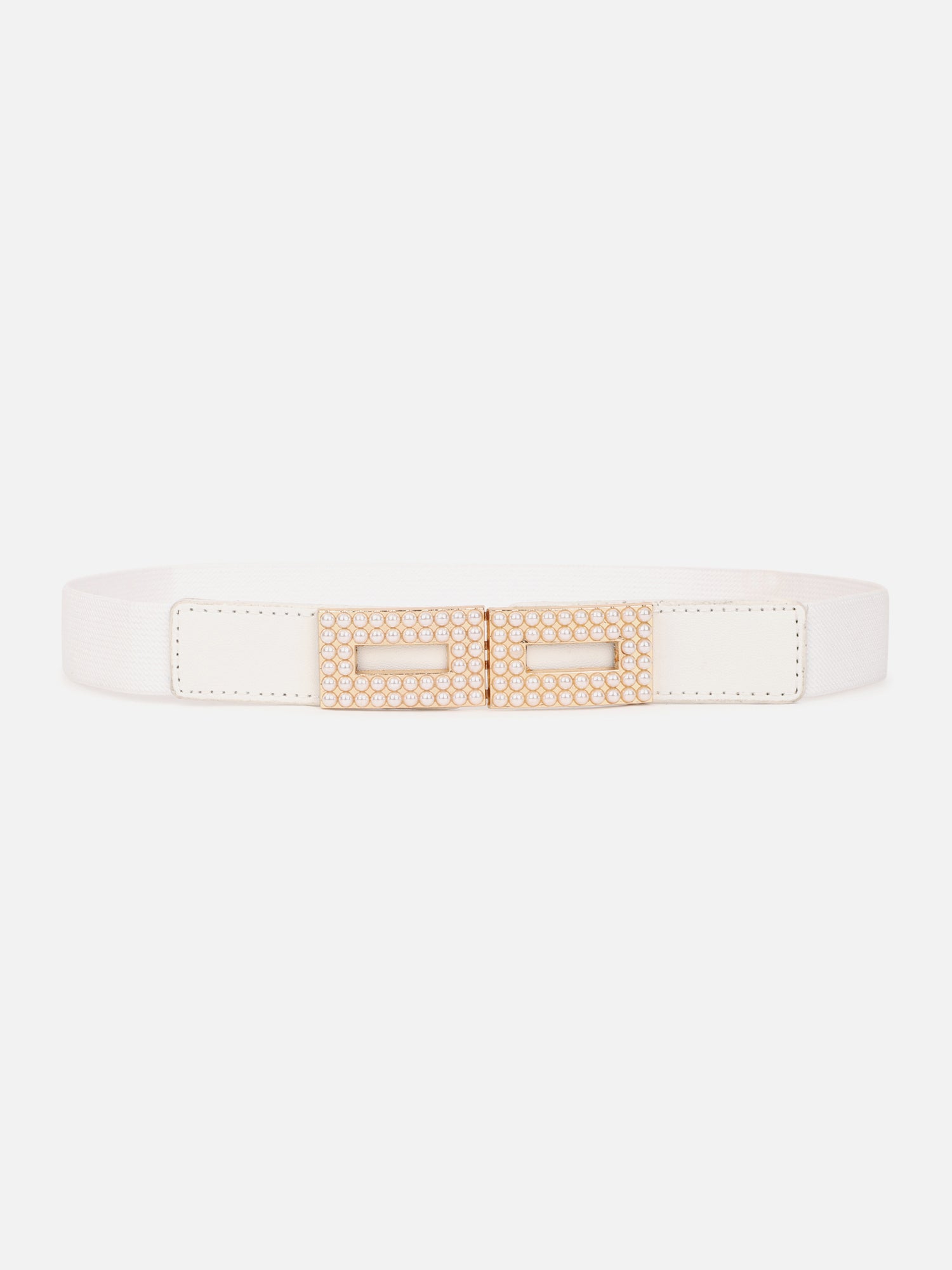 Berrylush Women Solid White Golden Embellished Pearl Studded PU Nylon Interlock Regular Slim Belt