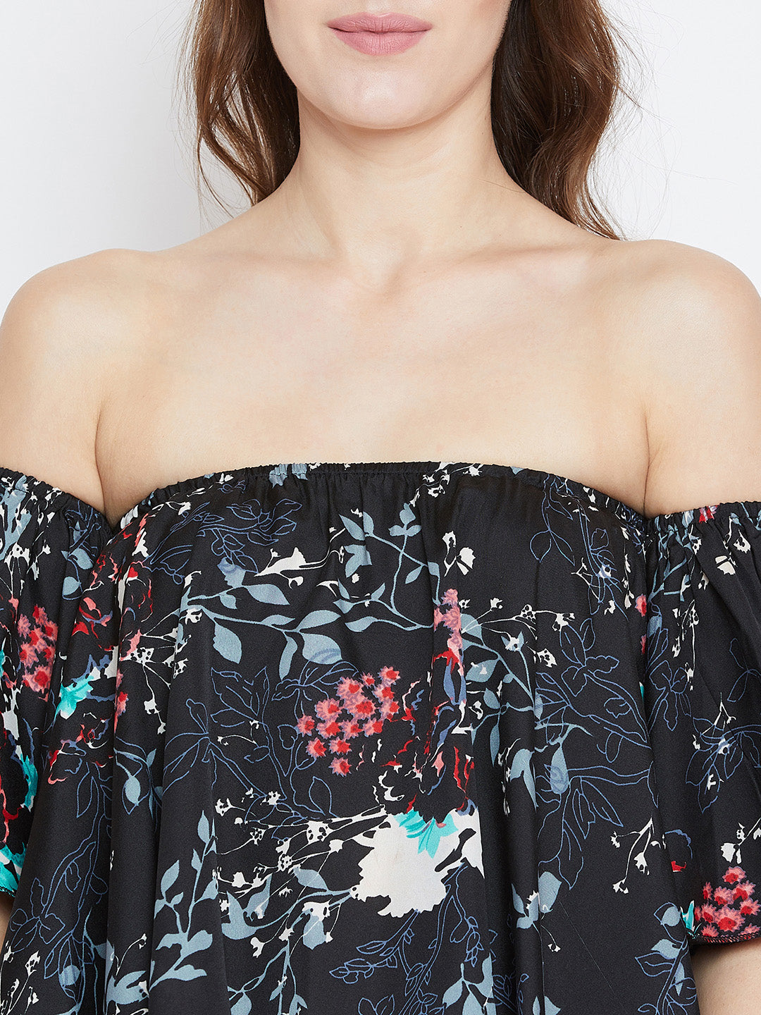 Berrylush Women Black & Multicoloured Floral Printed Off-Shoulder Neck Ruffled Crop Bardot Top