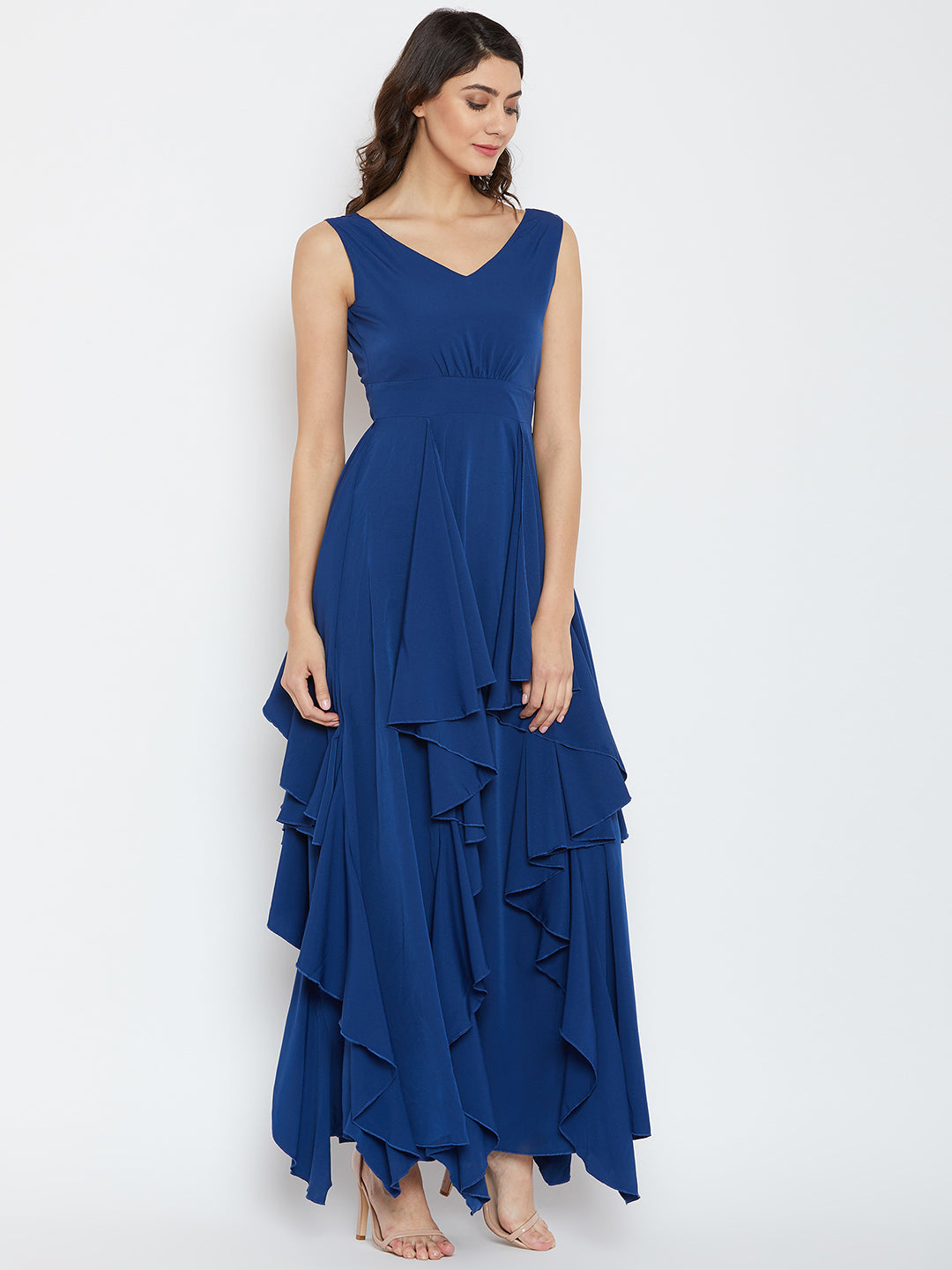 Berrylush Women Solid Blue V-Neck Sleeveless Open-Back Ruffled Maxi Dress