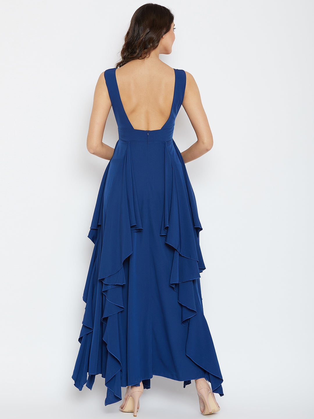 Keep your wardrobe trendy and eccentric by adding neutral ascent with this charming Solid Blue V-Neck Sleeveless Open-Back Ruffled Maxi Dress from Berrylush. This maxi dress enables you to keep up with the latest trend with a comfortable texture as its backless design gives an alluring exposure to your back part while the woven polyester fabric provides irritation-free touch to your skin. Compromising a beautifully crafted V-neck design to lend an exotic highlight to your neckline and the sleeveless feature offers enough disclosure to your beautiful arms. Complete the look by wearing this charismatic maxi dress with a pair of high-heels, minimalistic silver jewelry, and a sling bag to get a gorgeous final outlook.
