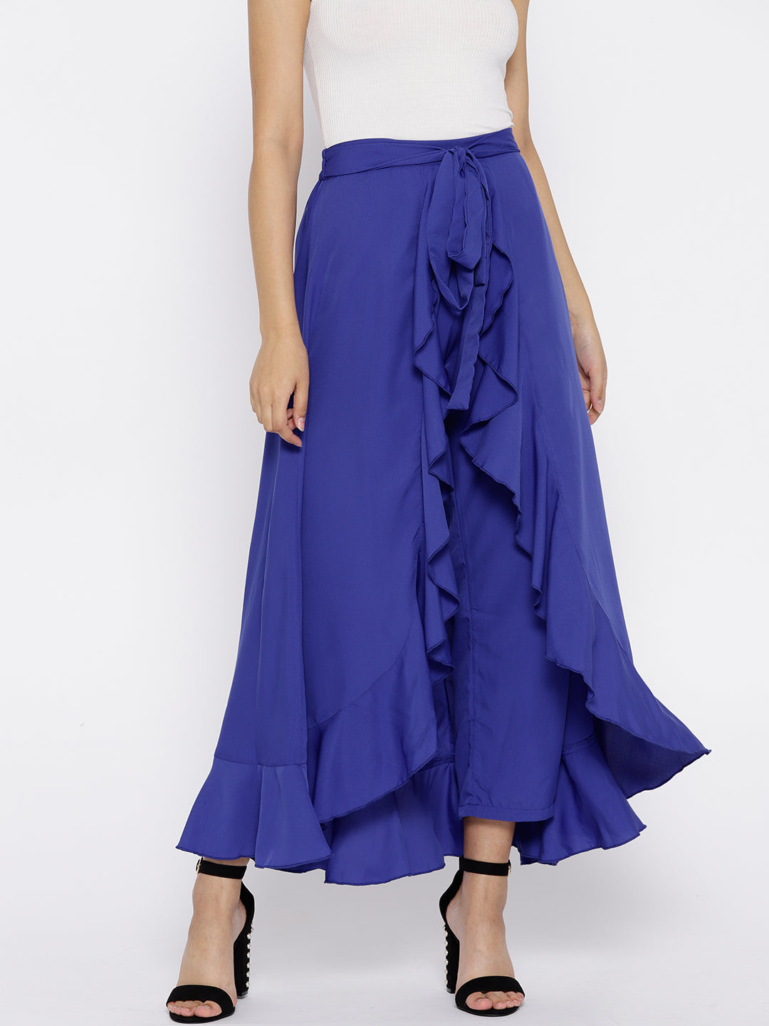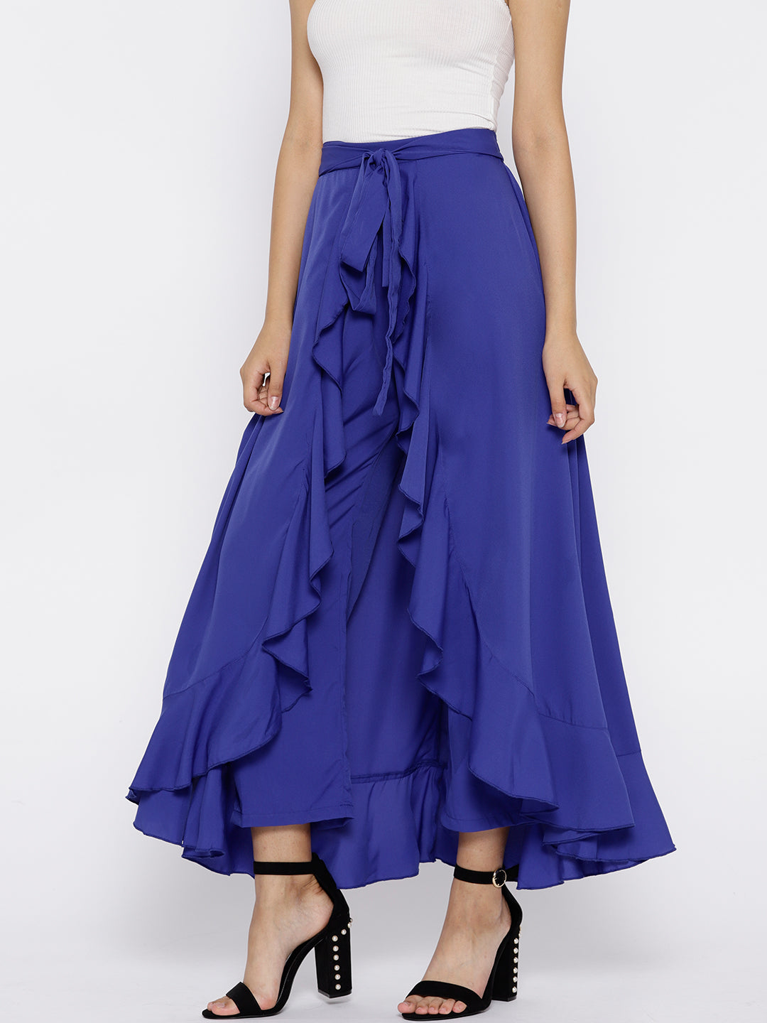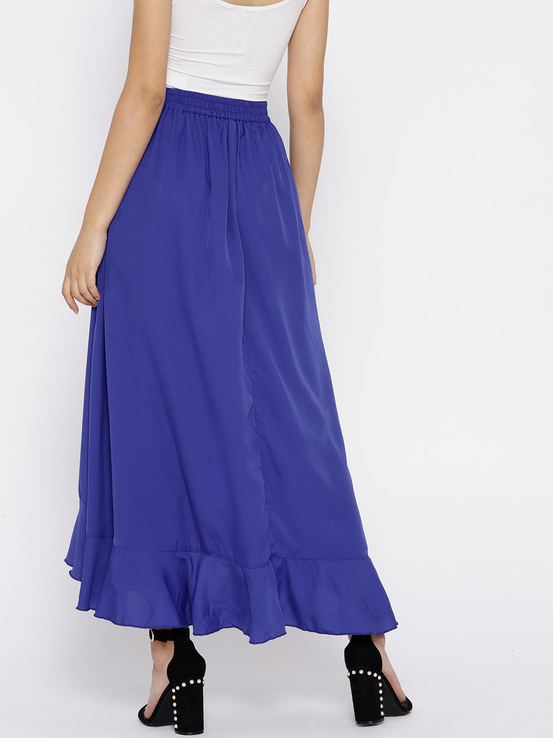 Construct your casual wardrobe minimally and efficiently to go well-versed and thematic with all the season by including this captivating Solid Blue Waist Tie-Up Ruffled Maxi Skirt with Attached Trousers from Berrylush to your wardrobe. This maxi dress enables you to keep up with the pace of changing trends with its unique style of front-slit which gives enough disclosure to the trousers attached with the skirt. The flared hemline of the skirt and breathable silhouette of the trousers presents a patterned profile for an astonishing appeal. To get a chic casual appearance you can also wear this amazing maxi skirt with a crop top, high heels, and a sling bag.