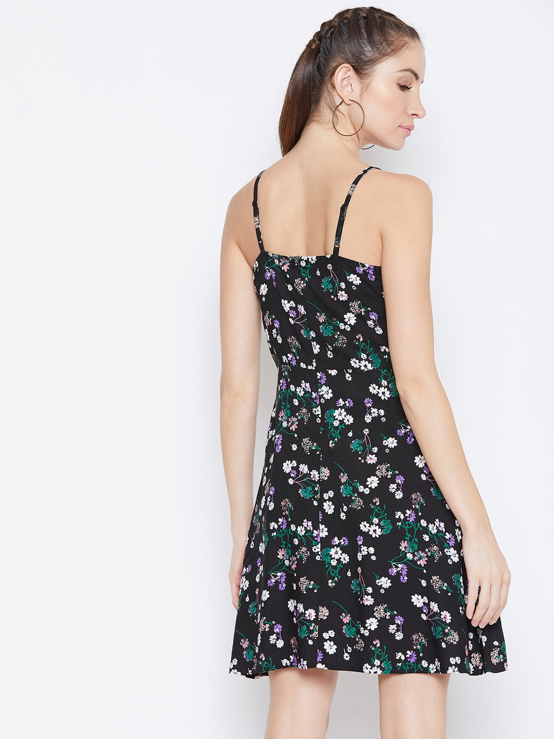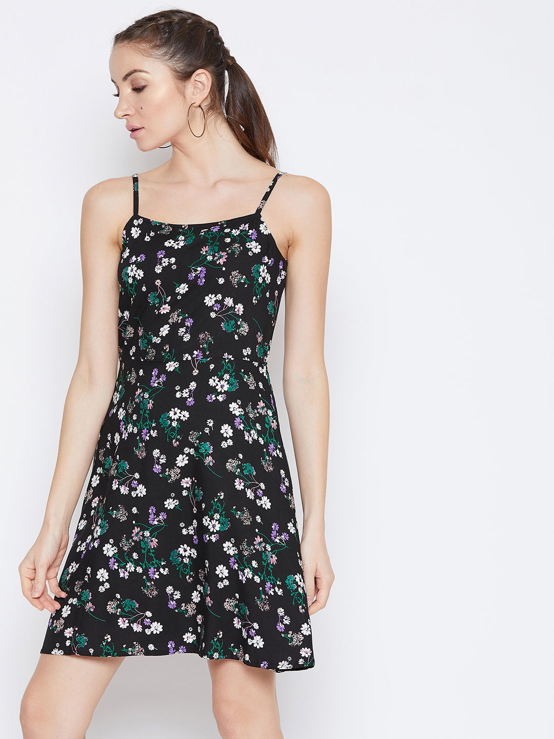 Redefine your casual look with stylish touch by wearing this Black & Green Floral Printed Sleeveless Fit & Flare Mini Dress from Berrylush. Designed with sleeveless design and shoulder strap neckline to flaunt your regular day look effortlessly. The flared hemline adjoin with semi-fit creates a bouncy look with contouring fit to your upper body. The mini-length feature of the dress crafted out of polyester fabric makes the look effortlessly stylish. Allover green floral print on the black colour efficiently defines vintage and charming vibe while woven weave gives a smooth texture to the dress. You can pair this amazing mini dress with minimalistic earrings and platform heels to look stunning.