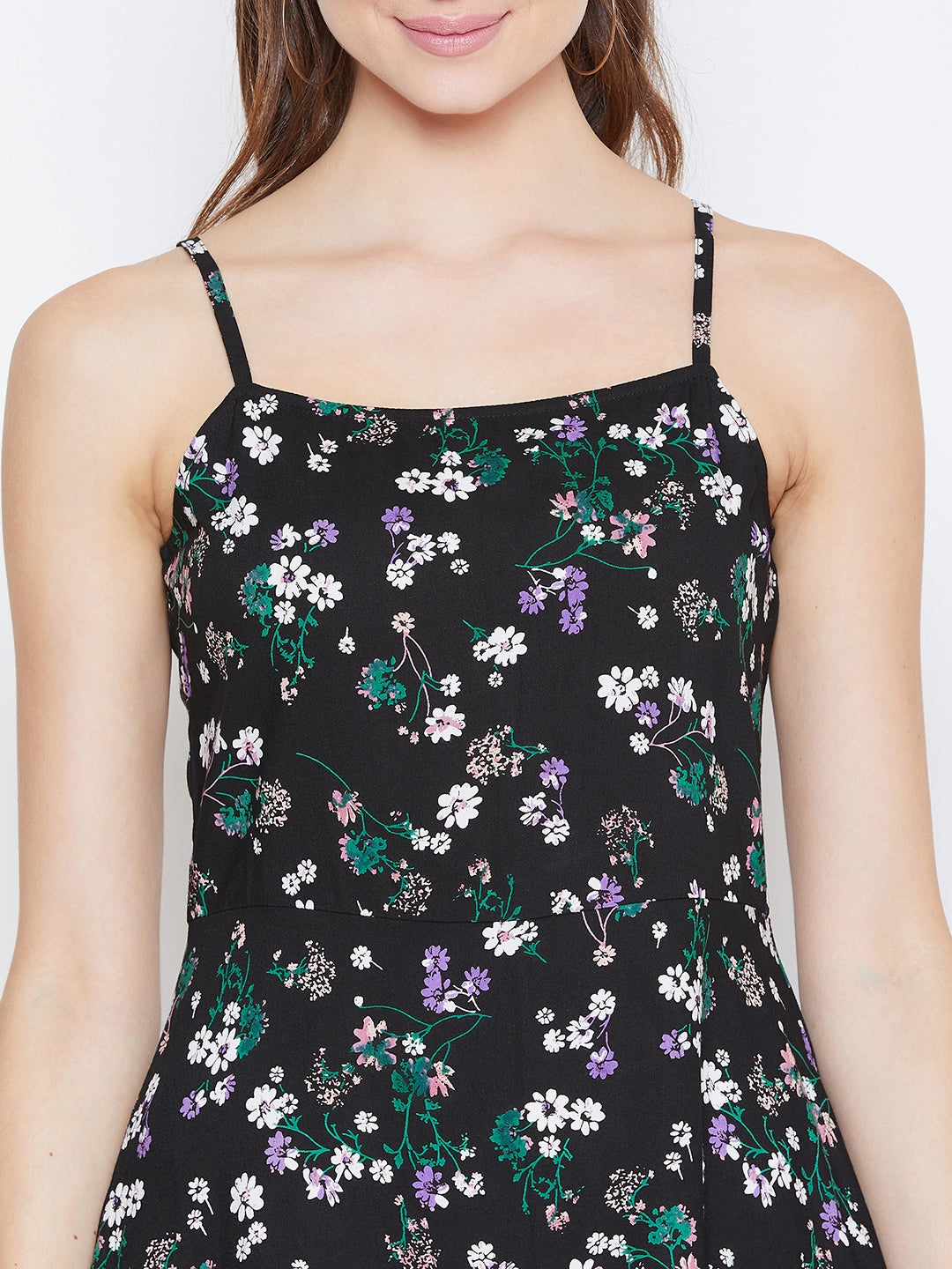 Berrylush Women Black & Green Floral Printed Sleeveless Fit & Flare Mini Dress