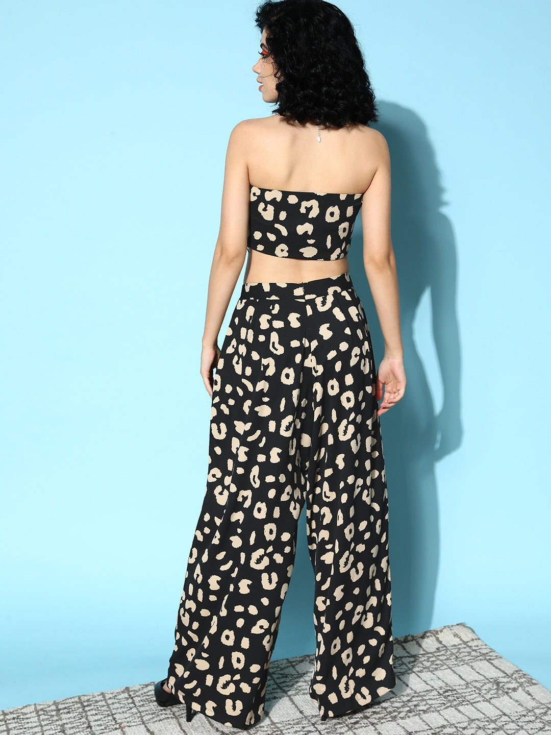 Berrylush Women Black & Beige Animal Printed Strapless Neck Front Tie-Up Tube Crop Top & Regular Palazzos Co-Ord Set