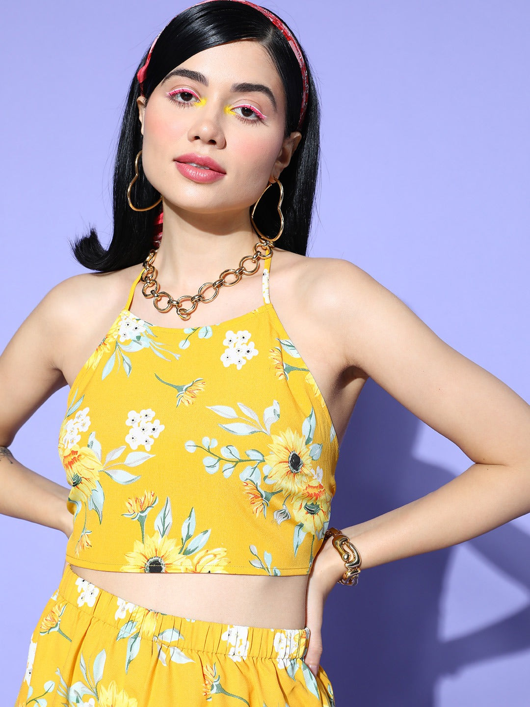 Berrylush Women Yellow & White Floral Printed Halter Neck Tie-Up Back Crop Top & Slip-On Mini Shorts Co-Ord Set