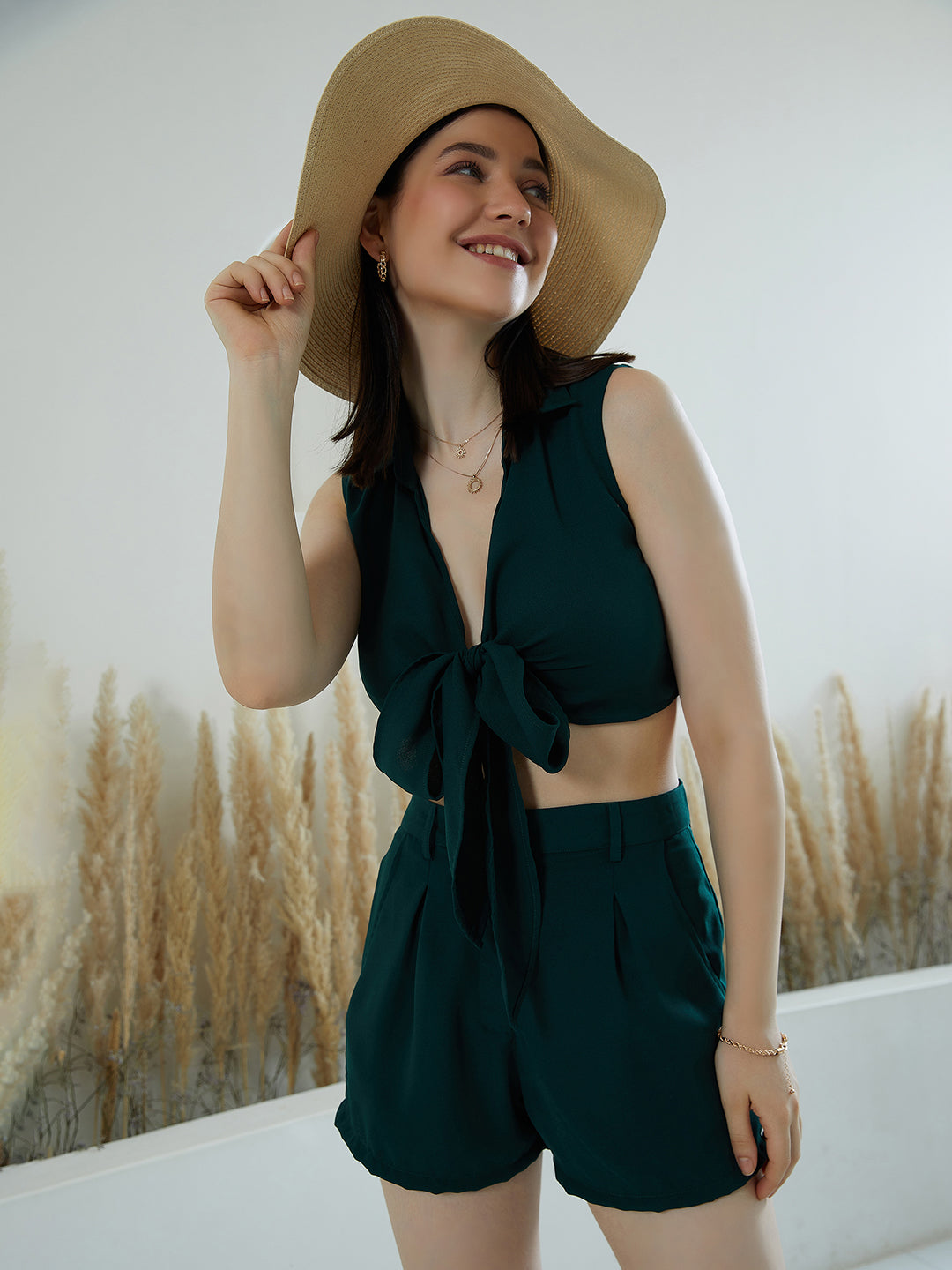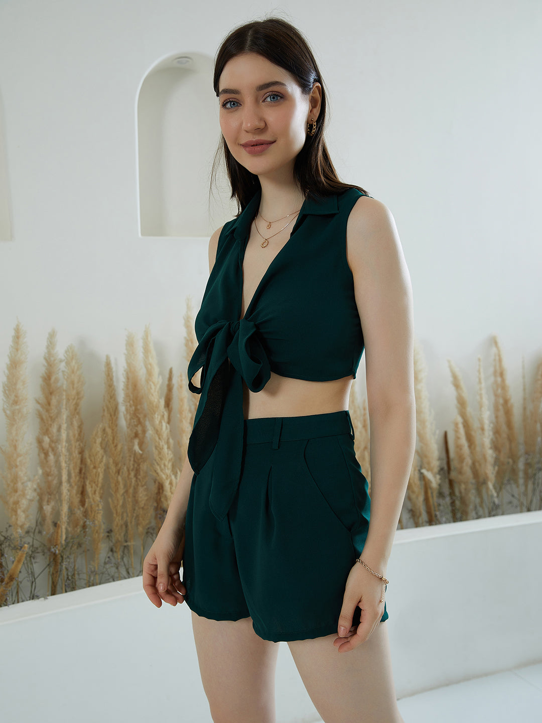 Berrylush Women Solid Green Shirt Collar Neck Front Tie-Up Polyester Crop Top & Mini Shorts Co-Ord Set