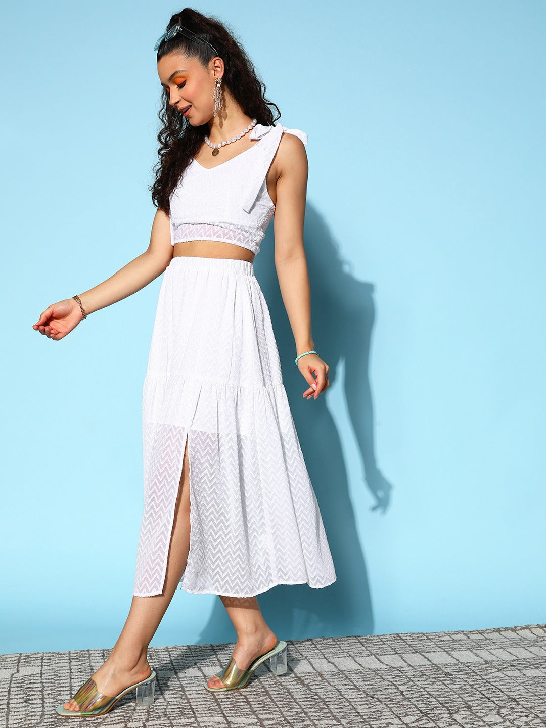 Berrylush Women Solid White Back Tie Shoulder Crop Cami Top & Slited Midi Skirt Co-Ord Set