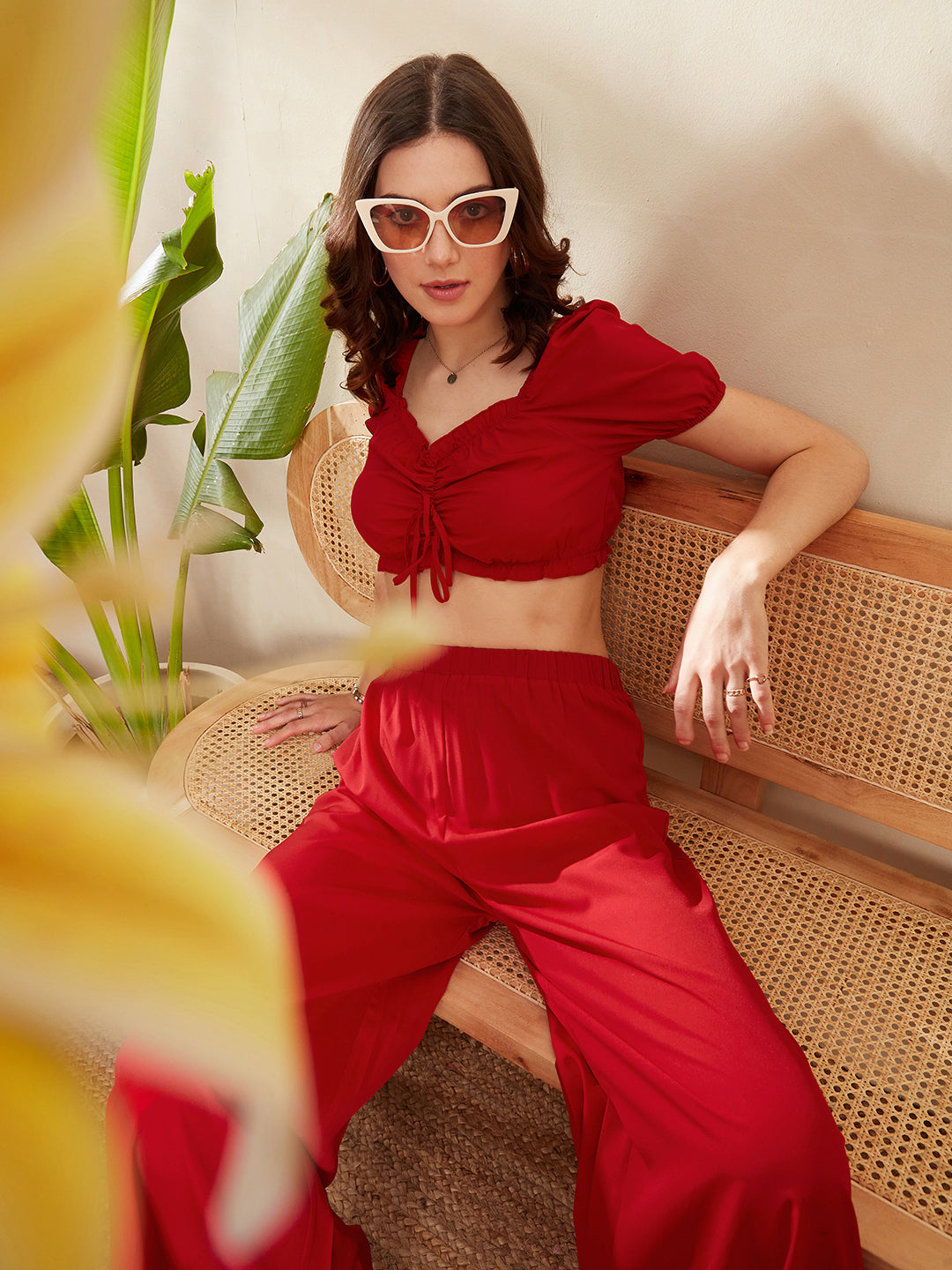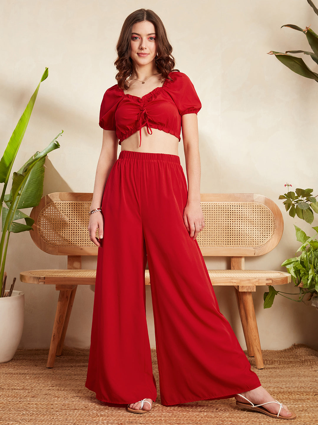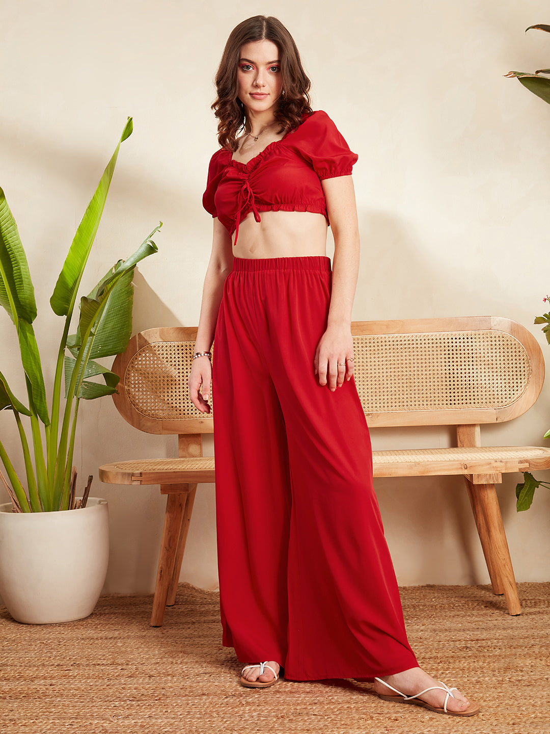 Berrylush Women Solid Red V-Neck Front Tie-Up Frilled Crop Top & Wide-Leg Pants Co-Ord Set