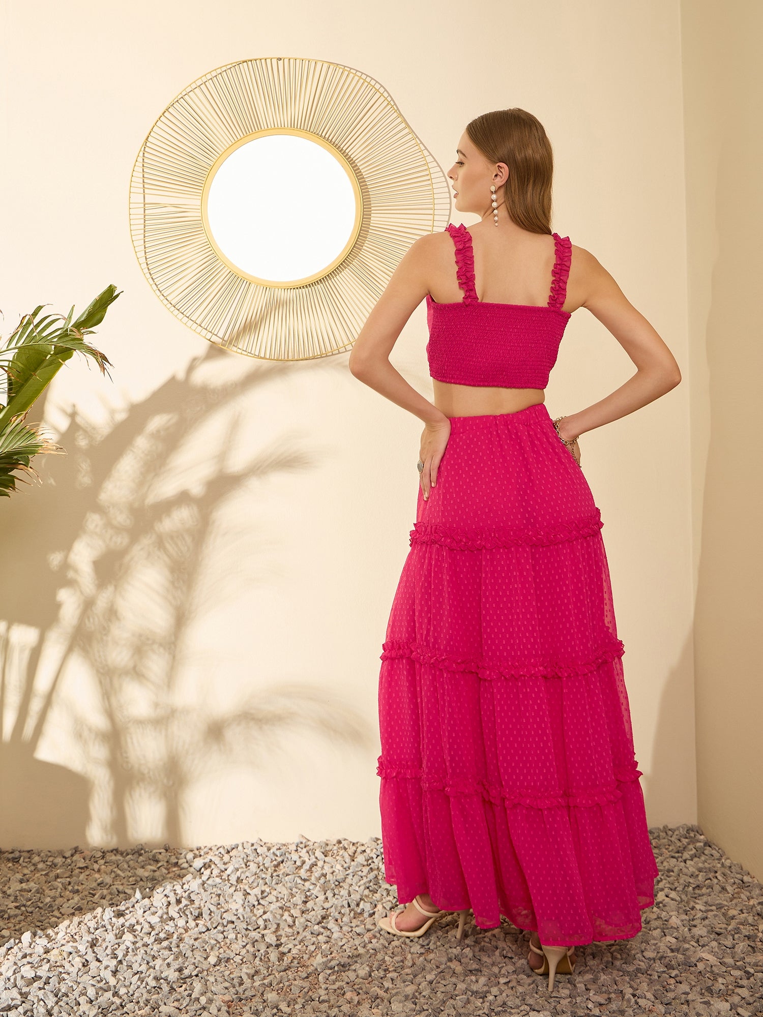 Introducing the Berrylush Solid Pink Co-Ord Set, where classic meets flirtatious charm. Perfect for any party scene, this outfit includes a twisted crop top featuring a seductive sweetheart neckline and tasteful front cutout details that add an edge of allure. The top pairs seamlessly with the high-rise flared maxi skirt, designing a silhouette that celebrates your curves while promising comfort with its elastic waistband. Crafted from lightweight polyester in dobby weave and coloured in an enchanting solid pink hue, this set ensures both style and ease without sacrificing elegance—complete with ruffed accents to enhance your movements gracefully through every twirl or step you take.