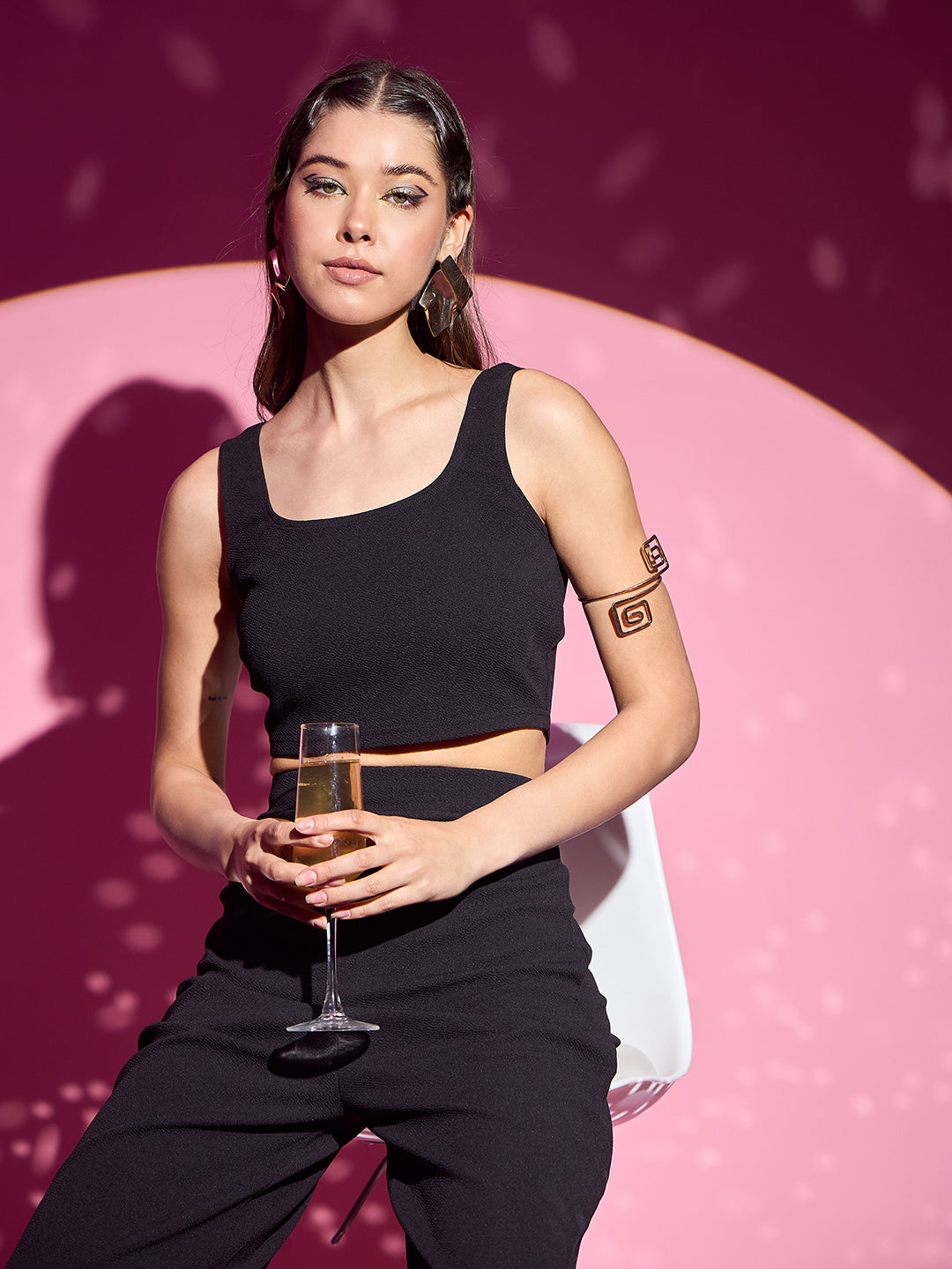 Berrylush Women Solid Black Scoop Neck Sleeveless Cropped Top & High-Rise Waist Wide-Leg Maxi Trousers Co-Ord Set