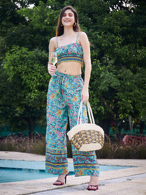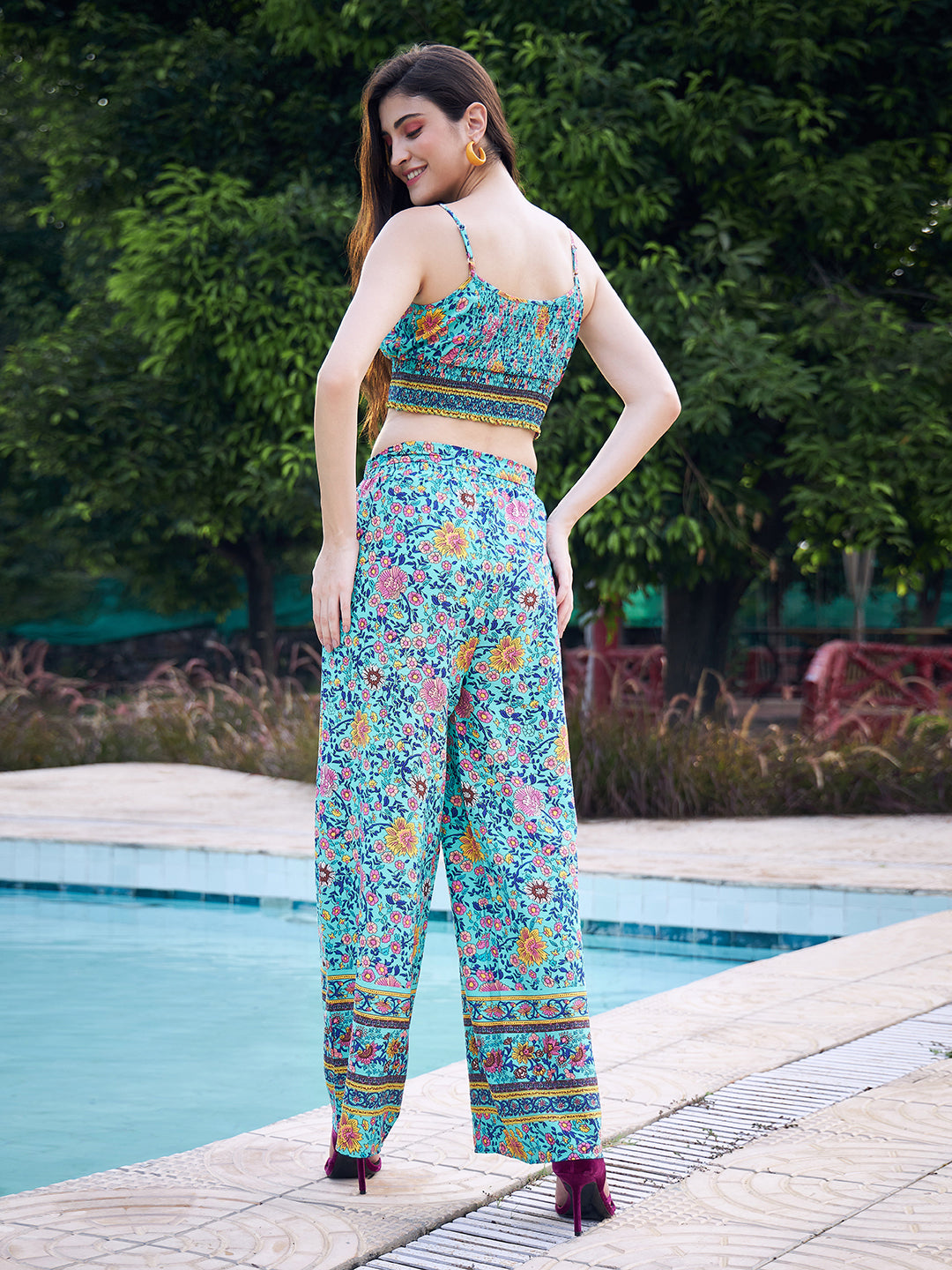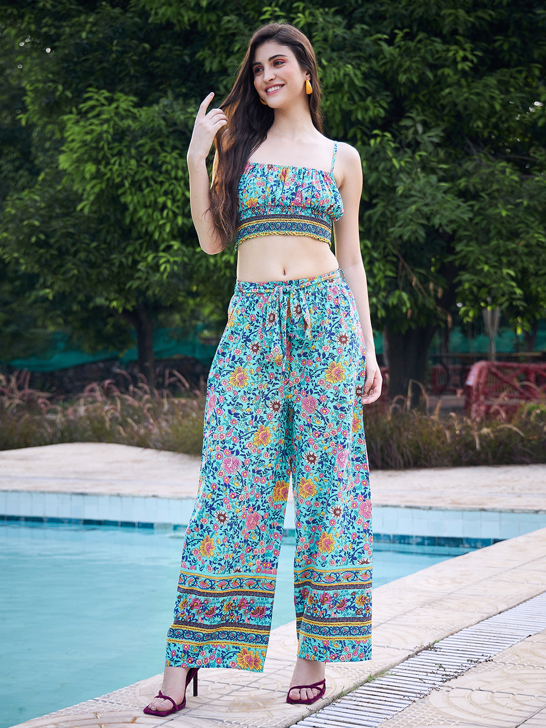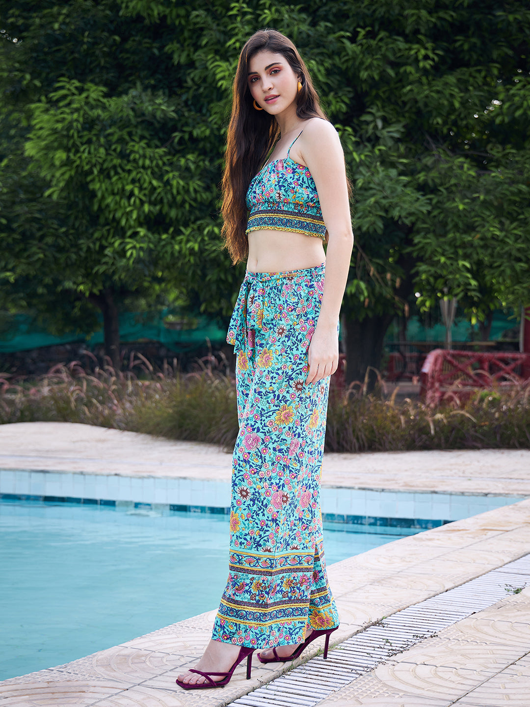 Berrylush Women Blue & Pink Tribal Printed Round Neck Waist Tie-Up Crop Top & Wide-Leg Trousers Set