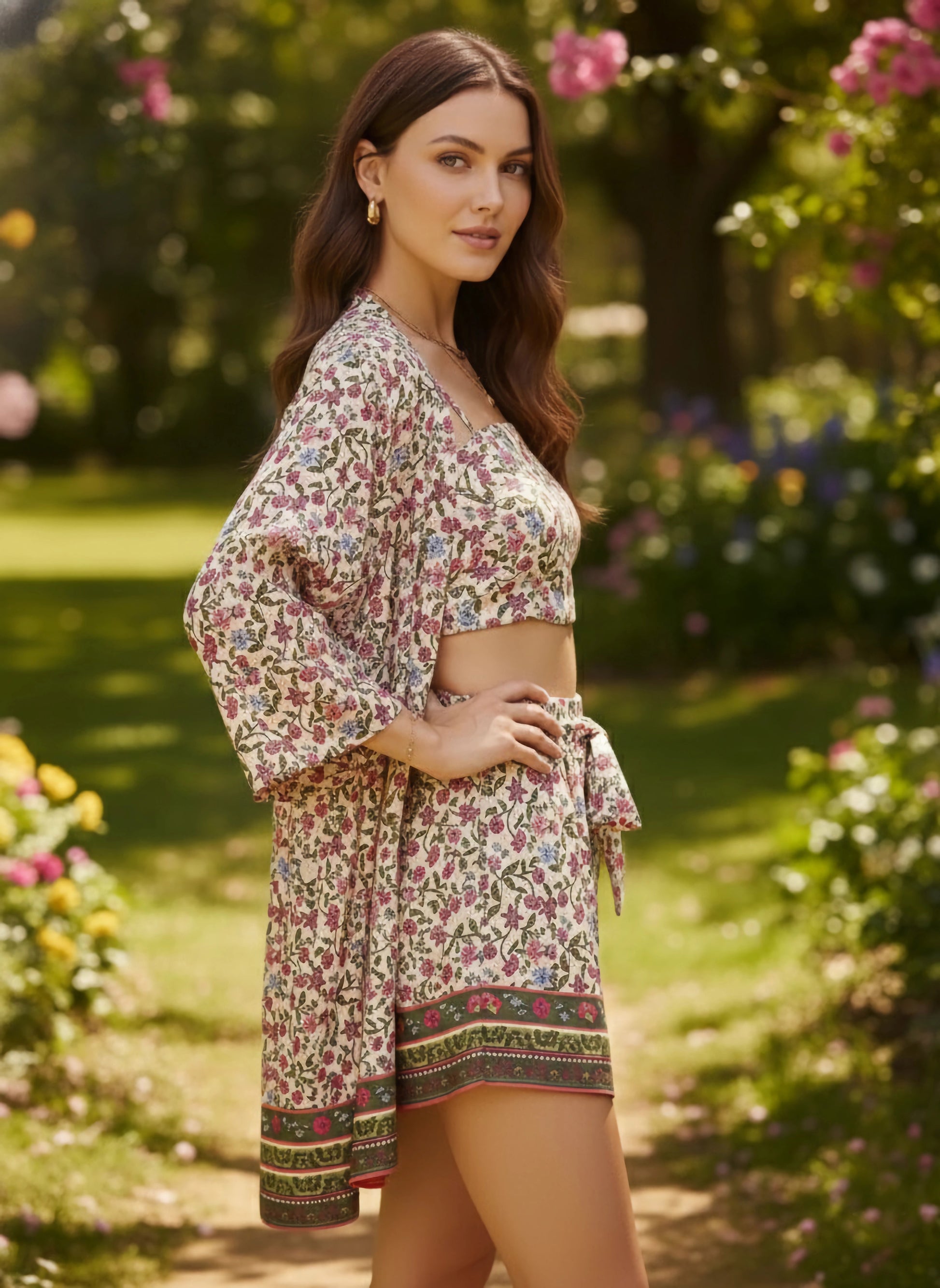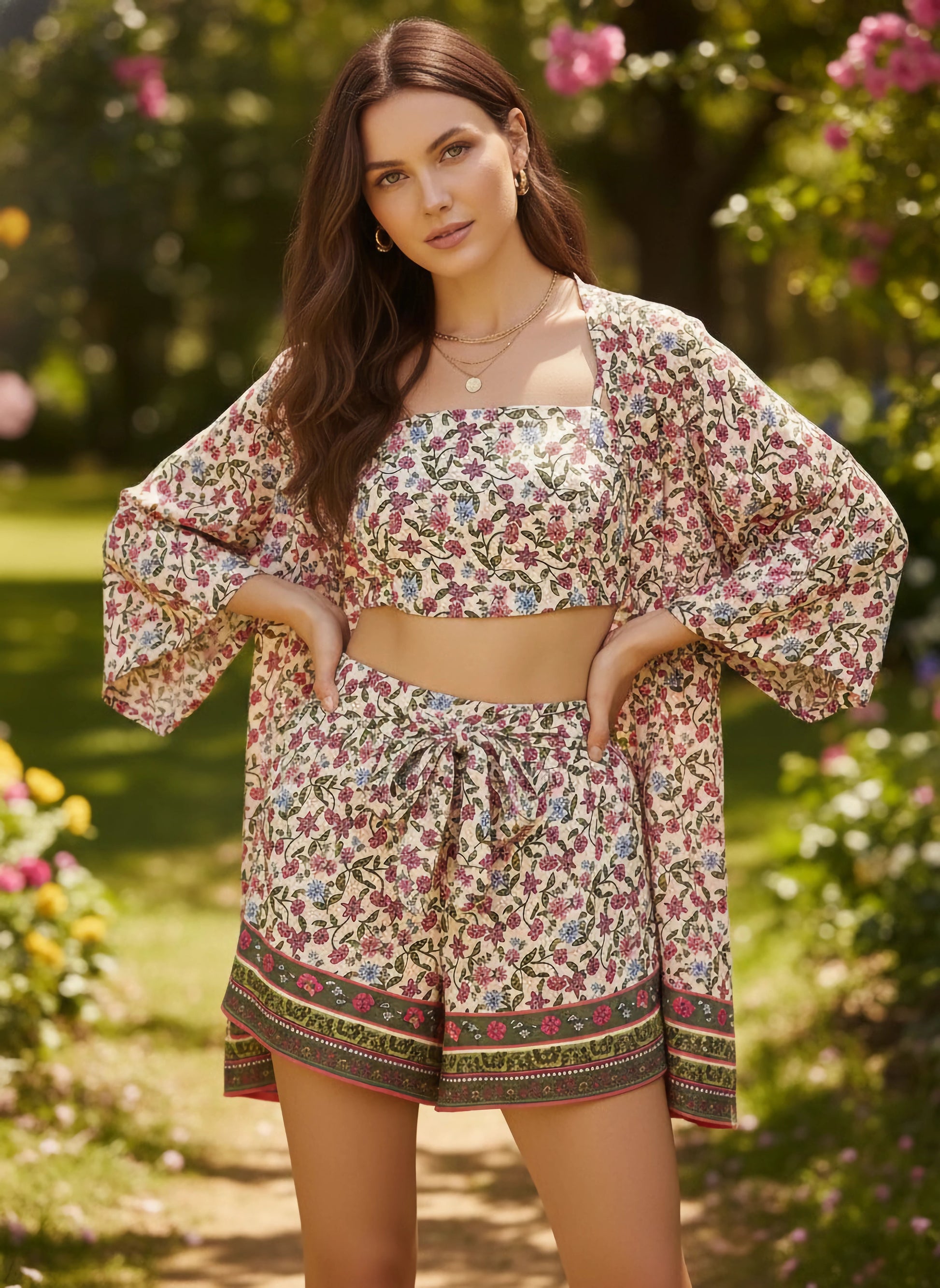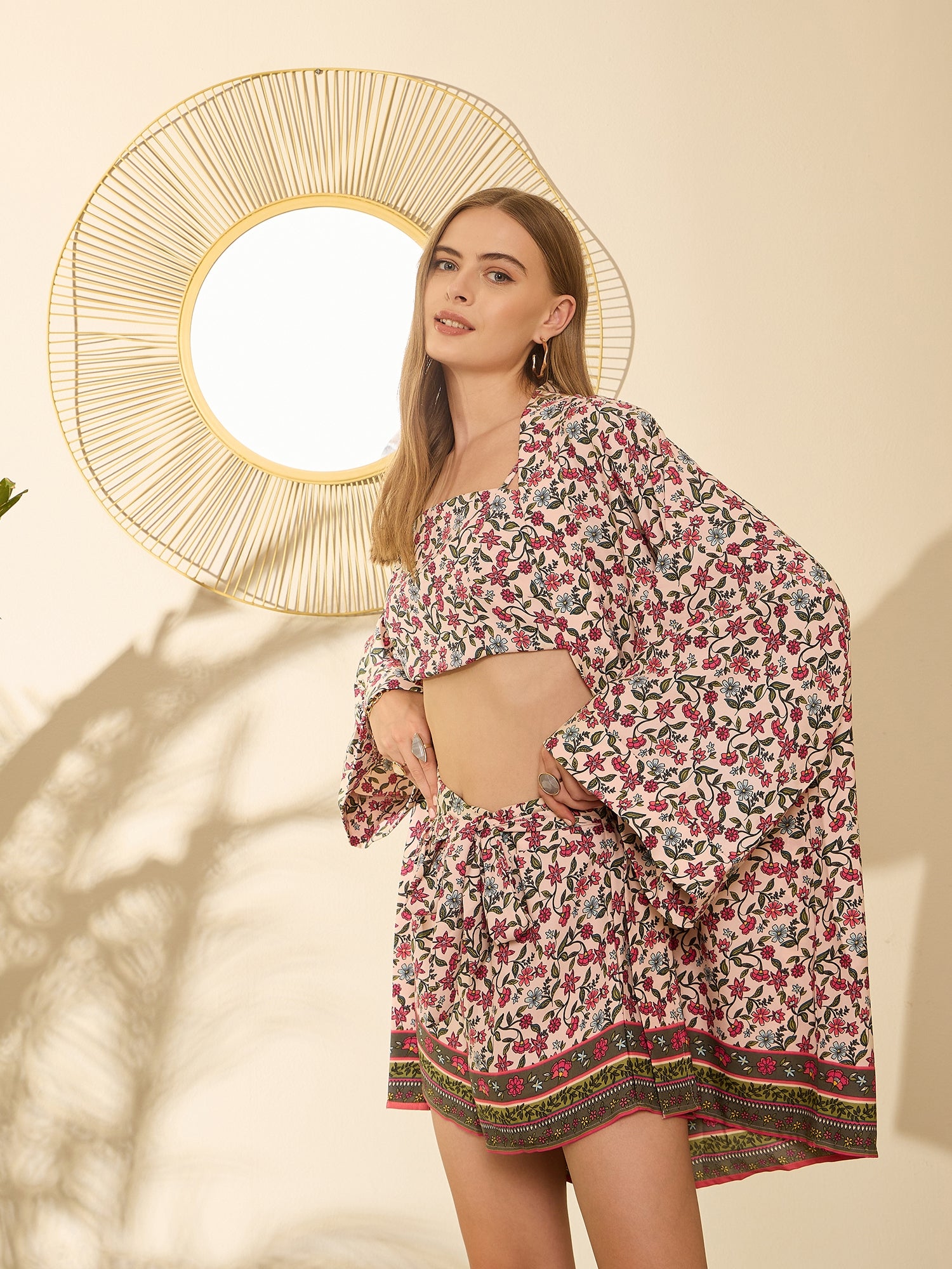 Berrylush Women Pink Floral Print Shoulder Straps 3 Piece Co-ords