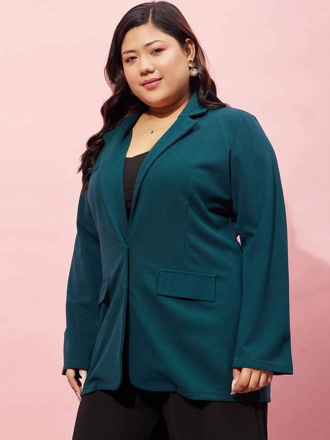 Berrylush Women Plus Size Solid Green Notched Lapel Neck Long Sleeve Open Front Longline Blazer