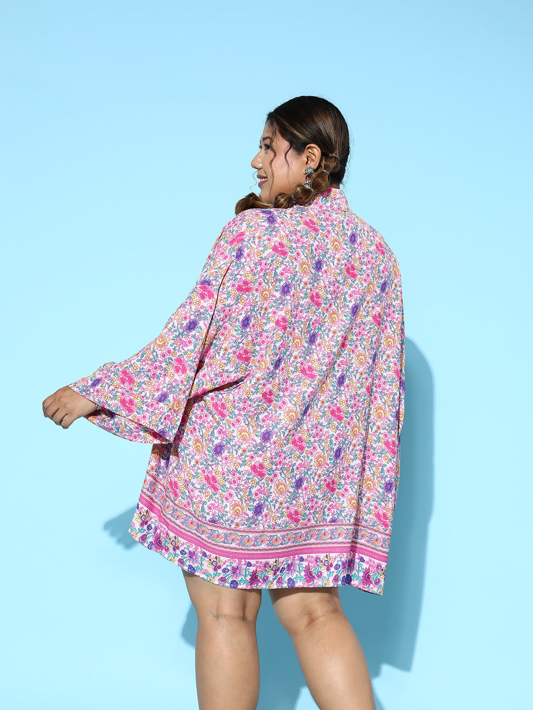 Berrylush Women Plus Size Pink & Purple Floral Printed Crop Top & Tie-Up Front Shorts With Kimono