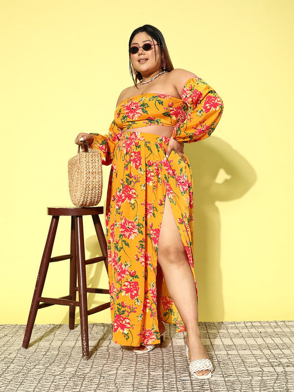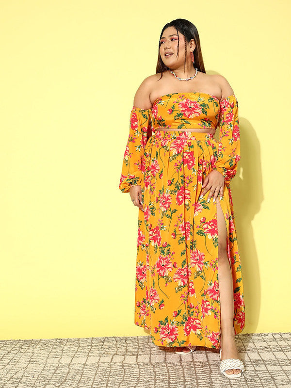 Berrylush Women Plus Size Yellow & Red Floral Printed Off-Shoulder Neck Crop Top & Slited Maxi Skirt Co-Ord Set