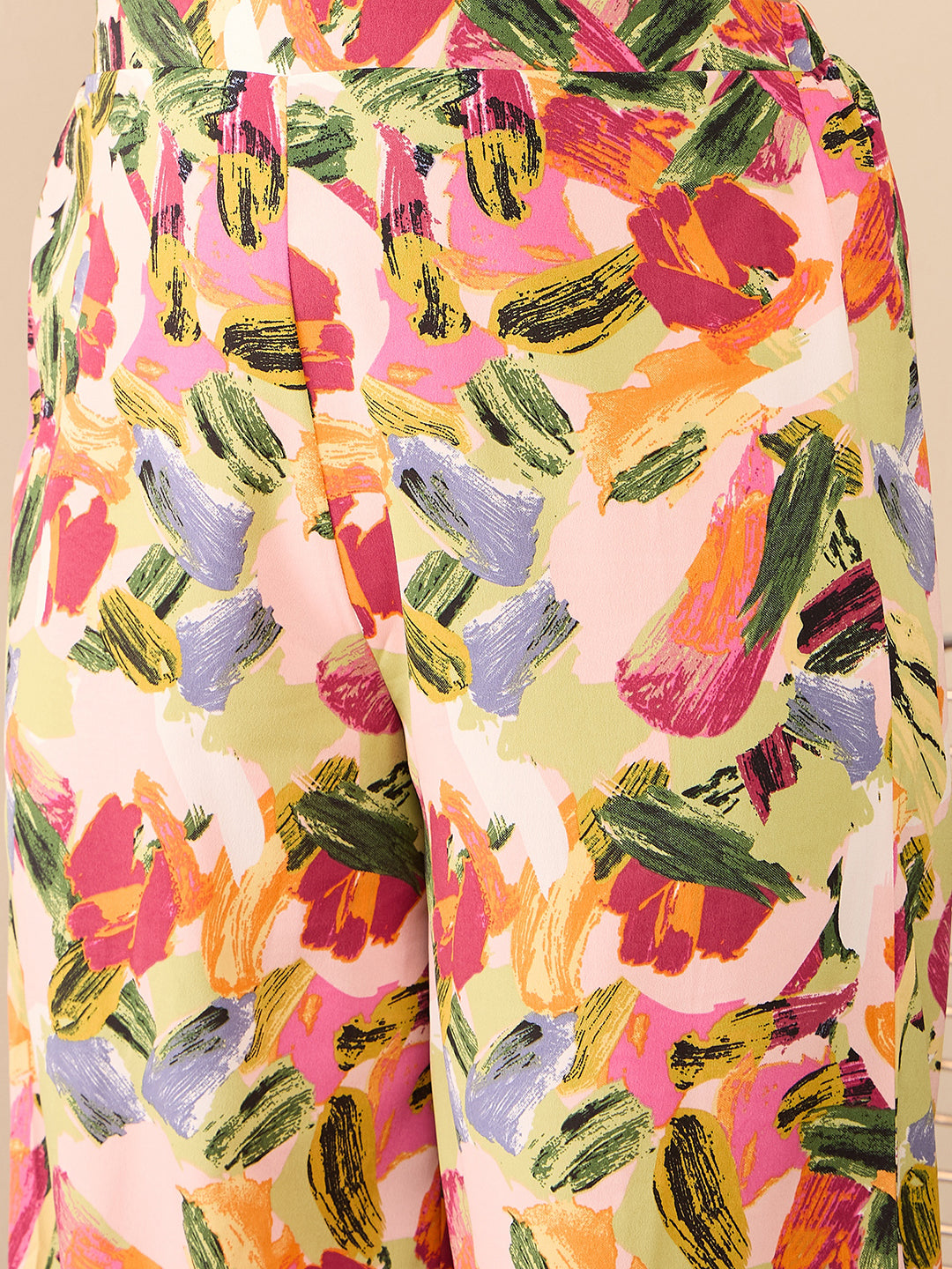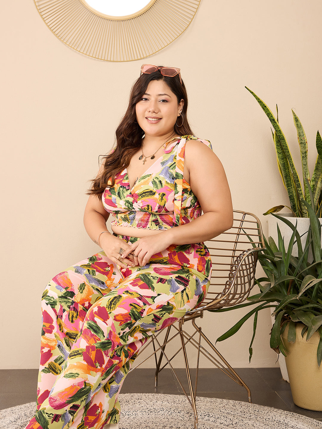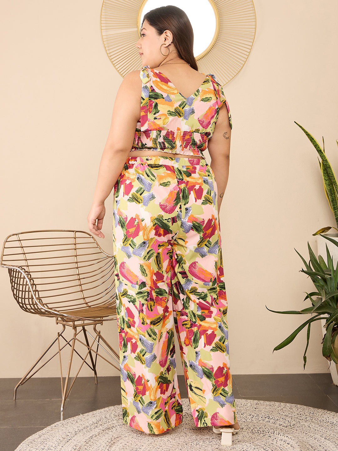 Berrylush Curve Women Pink & Multicolour Abstract Printed V-Neck Sleeveless Tie-Up Straps Cropped Top & Regular Trousers Co-Ord Set