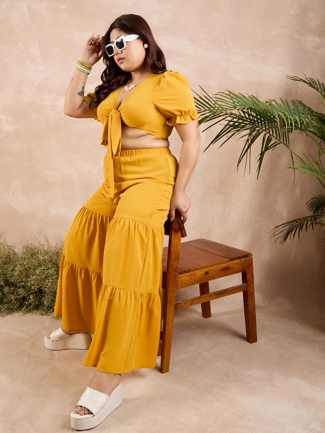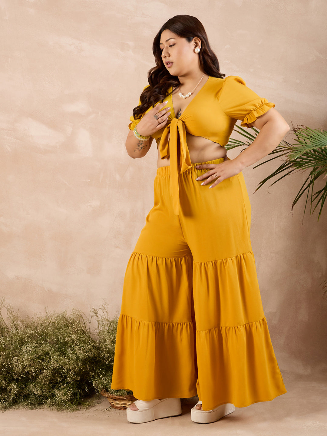 Berrylush Curve Women Solid Yellow V-Neck Puff Sleeves Front Tie-Up Cropped Top & Wide-Leg Maxi Trousers Co-Ord Set