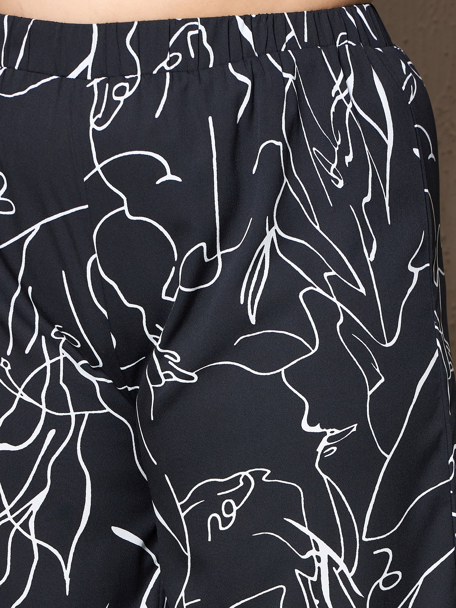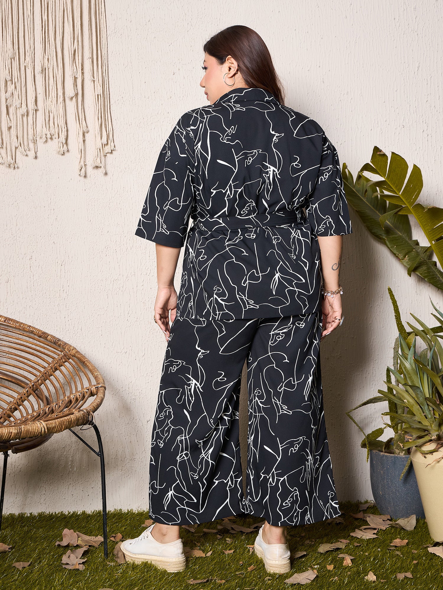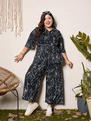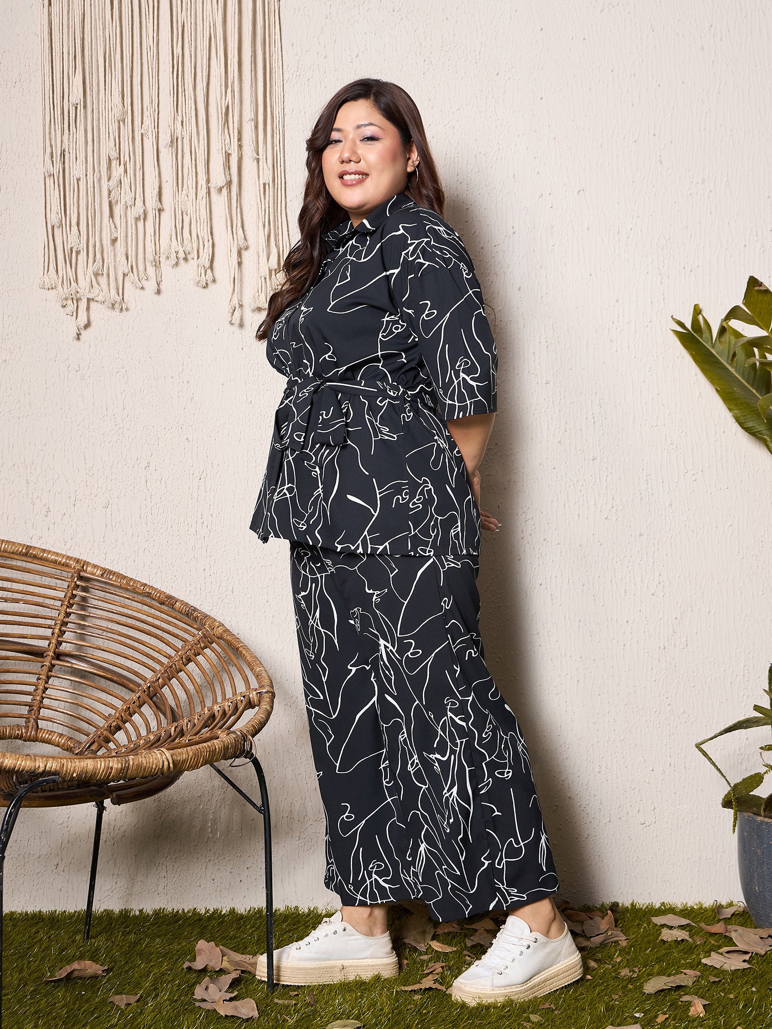 Berrylush Curve Women Black & White Abstract Printed Collar Neck Tie-Up Regular Shirt & High-Rise Elastic Wide-Leg Maxi Trousers Co-Ord Set
