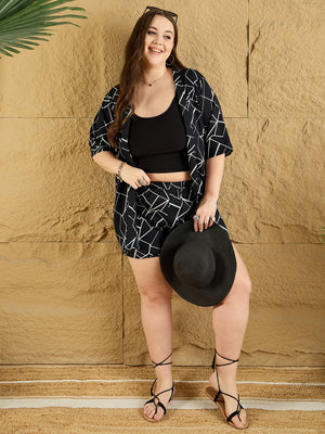 Introducing the captivating ensemble from Berrylush Curve your perfect pick for casual sophistication. This co-ord set features a black and white geometrical printed longline shrug with an effortlessly chic open-front neckline and smart three-quarter sleeves. The high-rise elastic waist mini shorts offer both comfort and style, making this outfit a standout in any wardrobe. Crafted from premium polyester fabric, the woven texture ensures durability while keeping it lightweight. Opaque and airy, this set promises to keep you cool through the day's adventures or relaxed evenings out! Let your style reflect elegance with this gorgeous geometric duo.
