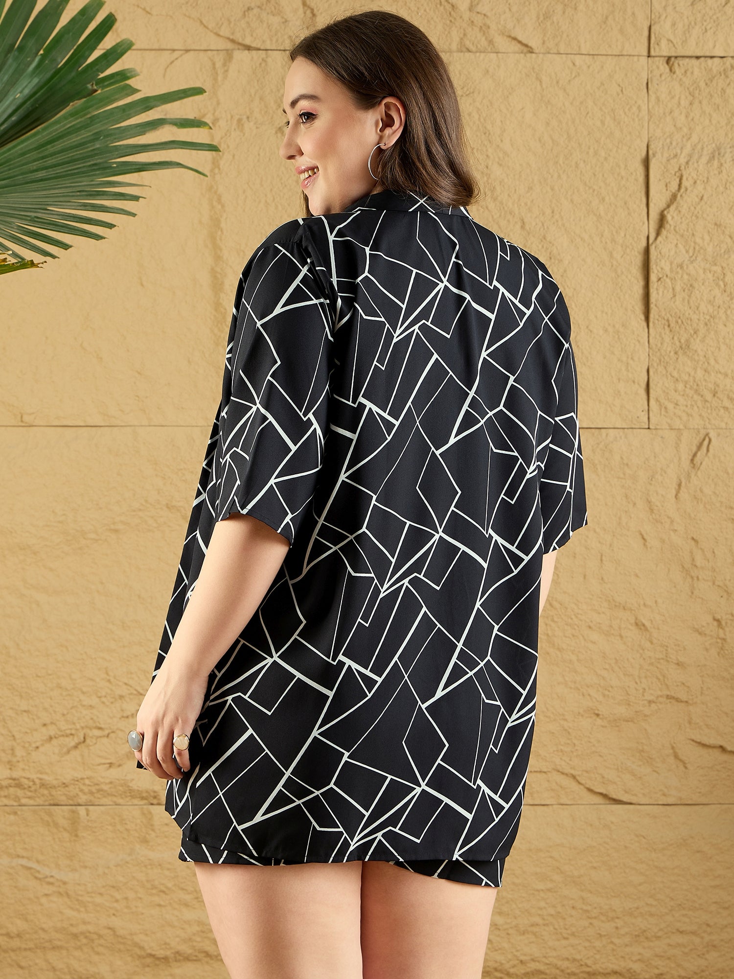 Berrylush Curve Women Black & White Geometrical Printed Open-Front Neck Three-Quarter Sleeves Longline Shrug & High-Rise Elastic Waist Mini Shorts Co-Ord Set