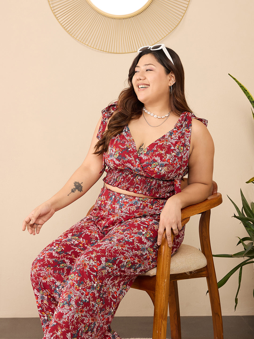 Berrylush Curve Women Maroon & White Floral Printed V-Neck Tie-Up Straps Smocked Crop Top & Wide-Leg Straight Hem Maxi Trouser Co-Ord Set