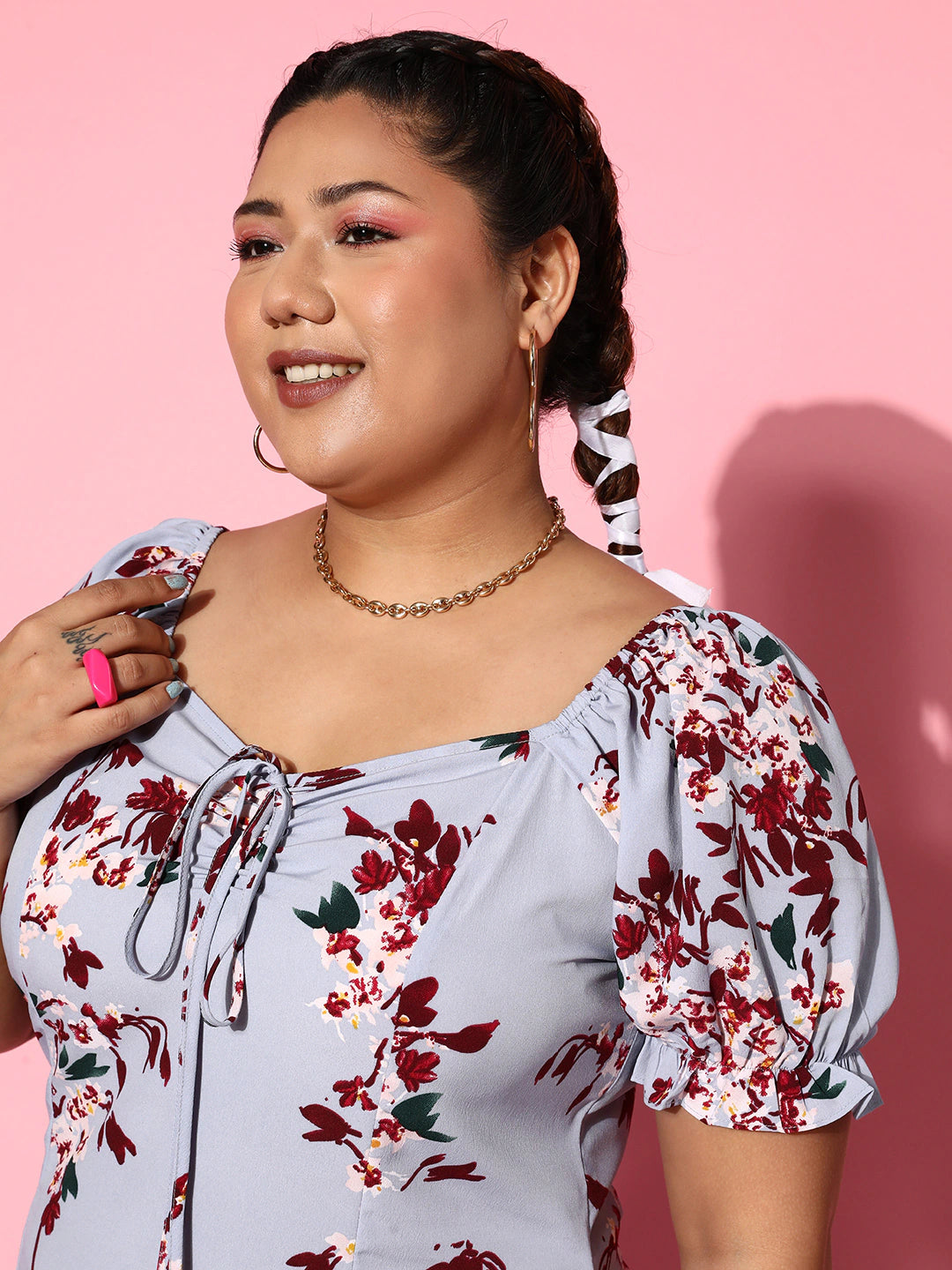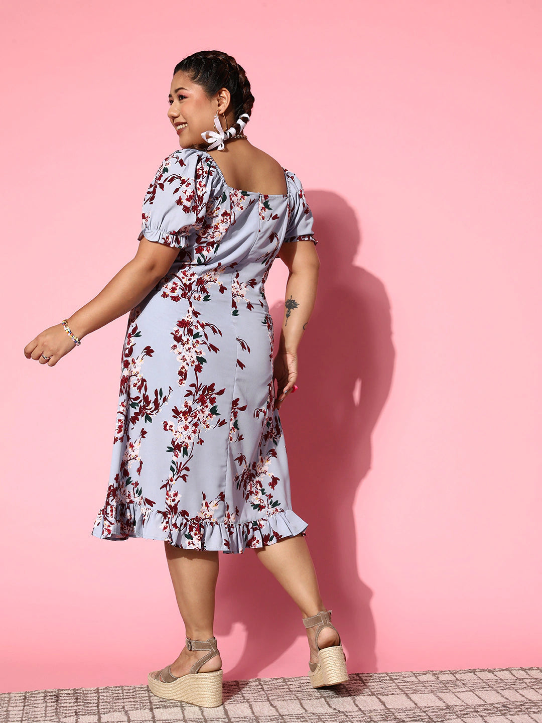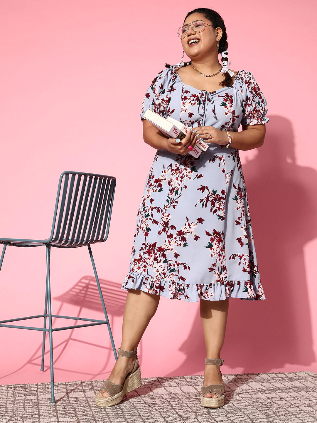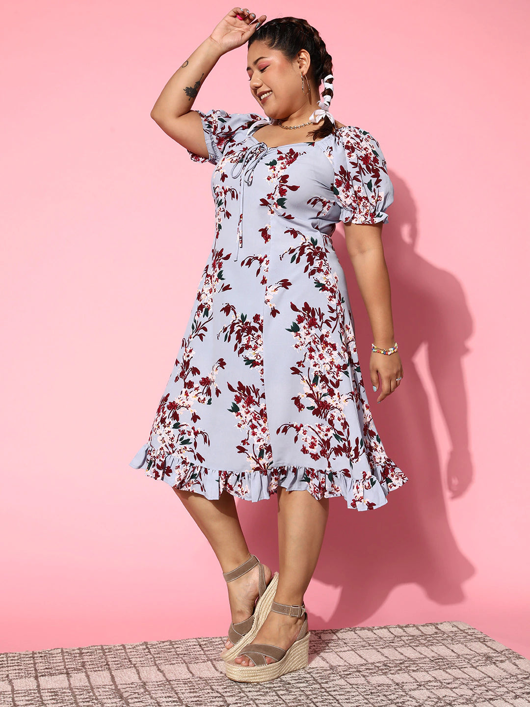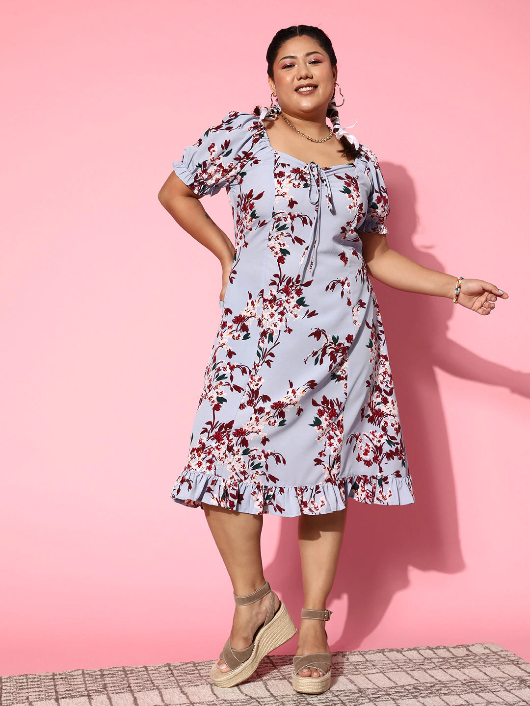 Berrylush Women Plus Size Blue & Maroon Floral Printed Sweetheart Neck Front Tie-Up Flounce Hem A-Line Midi Dress