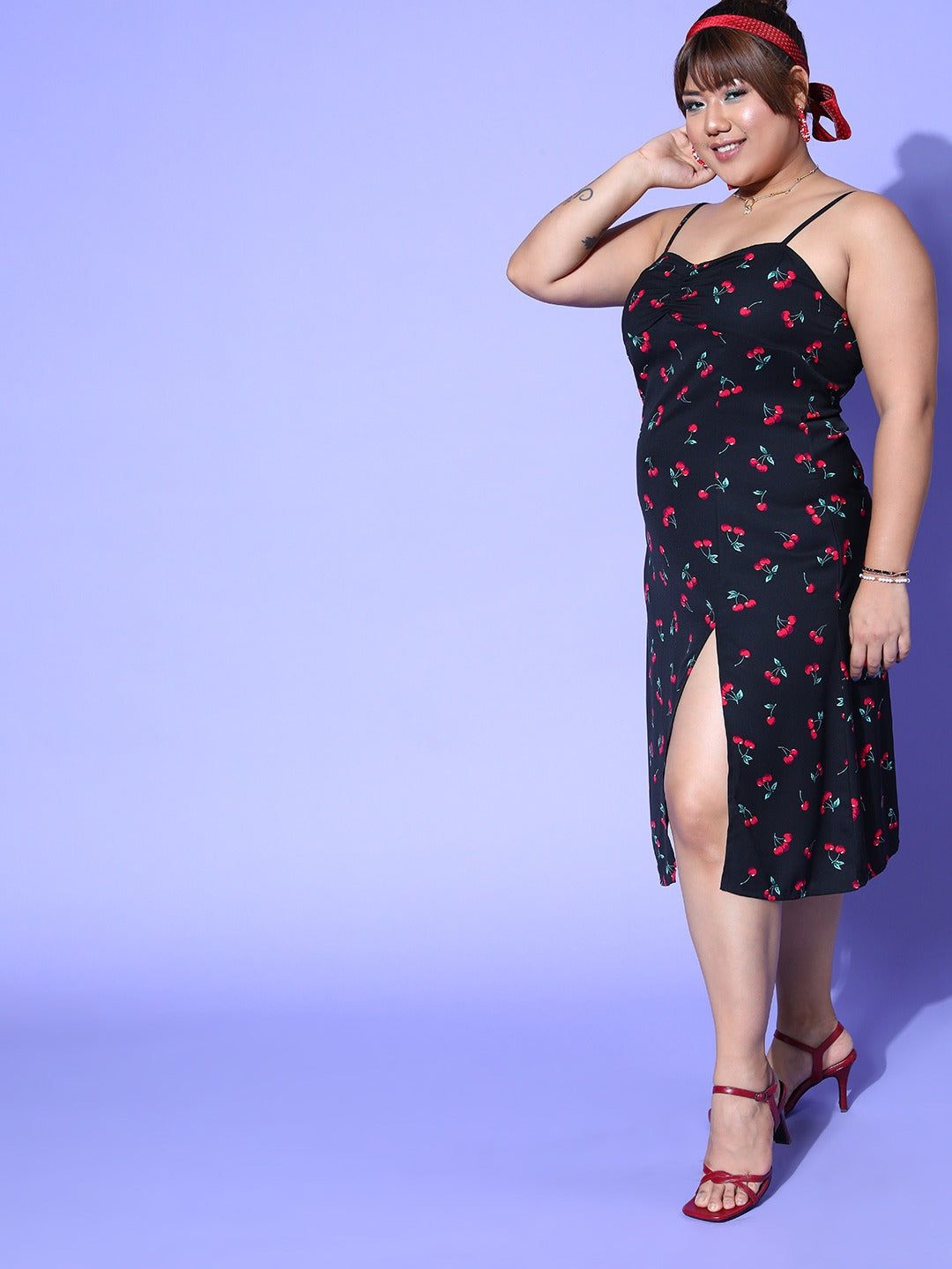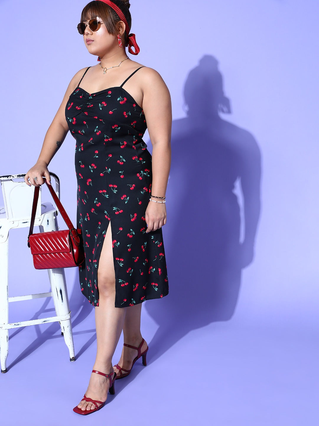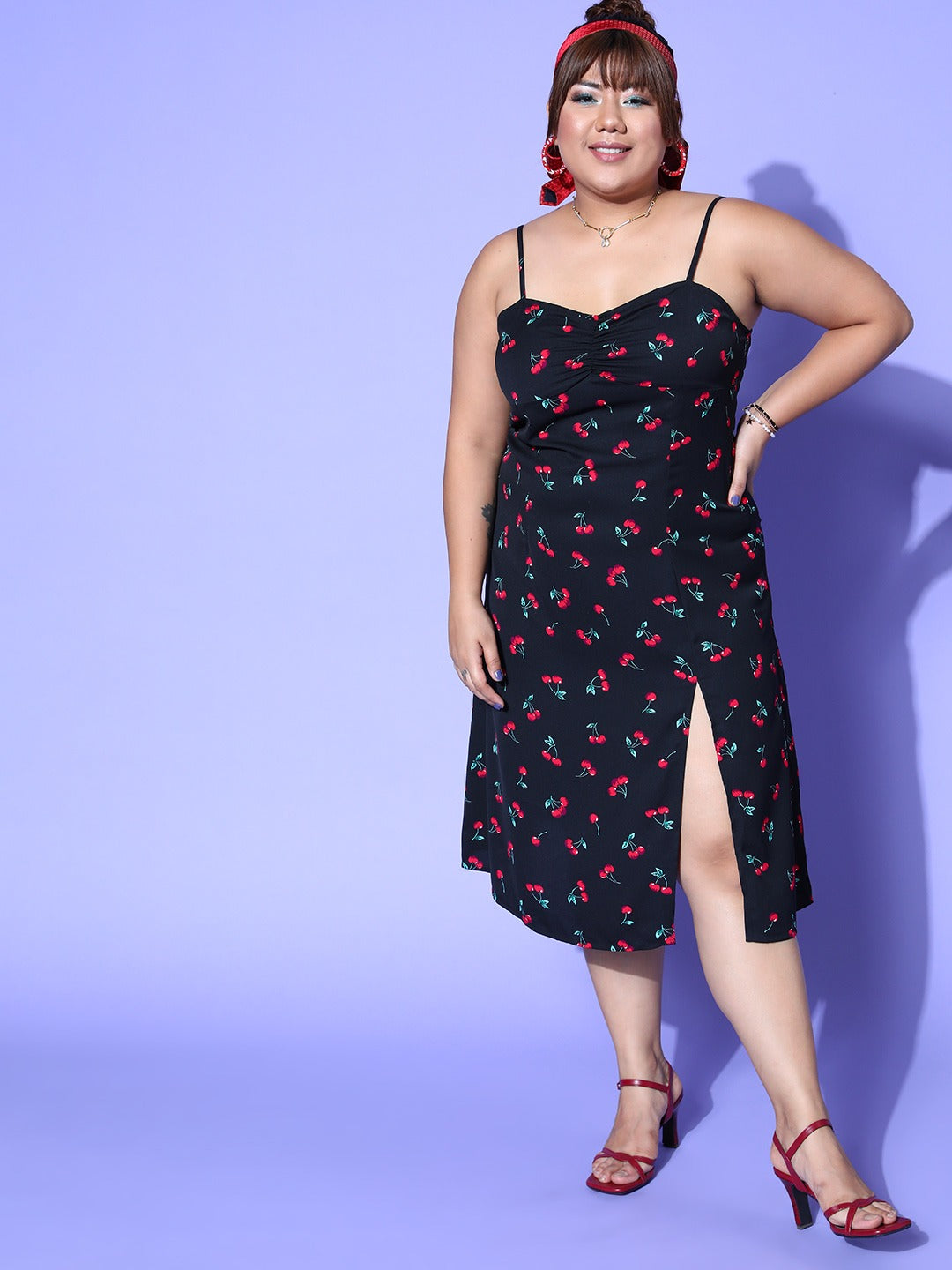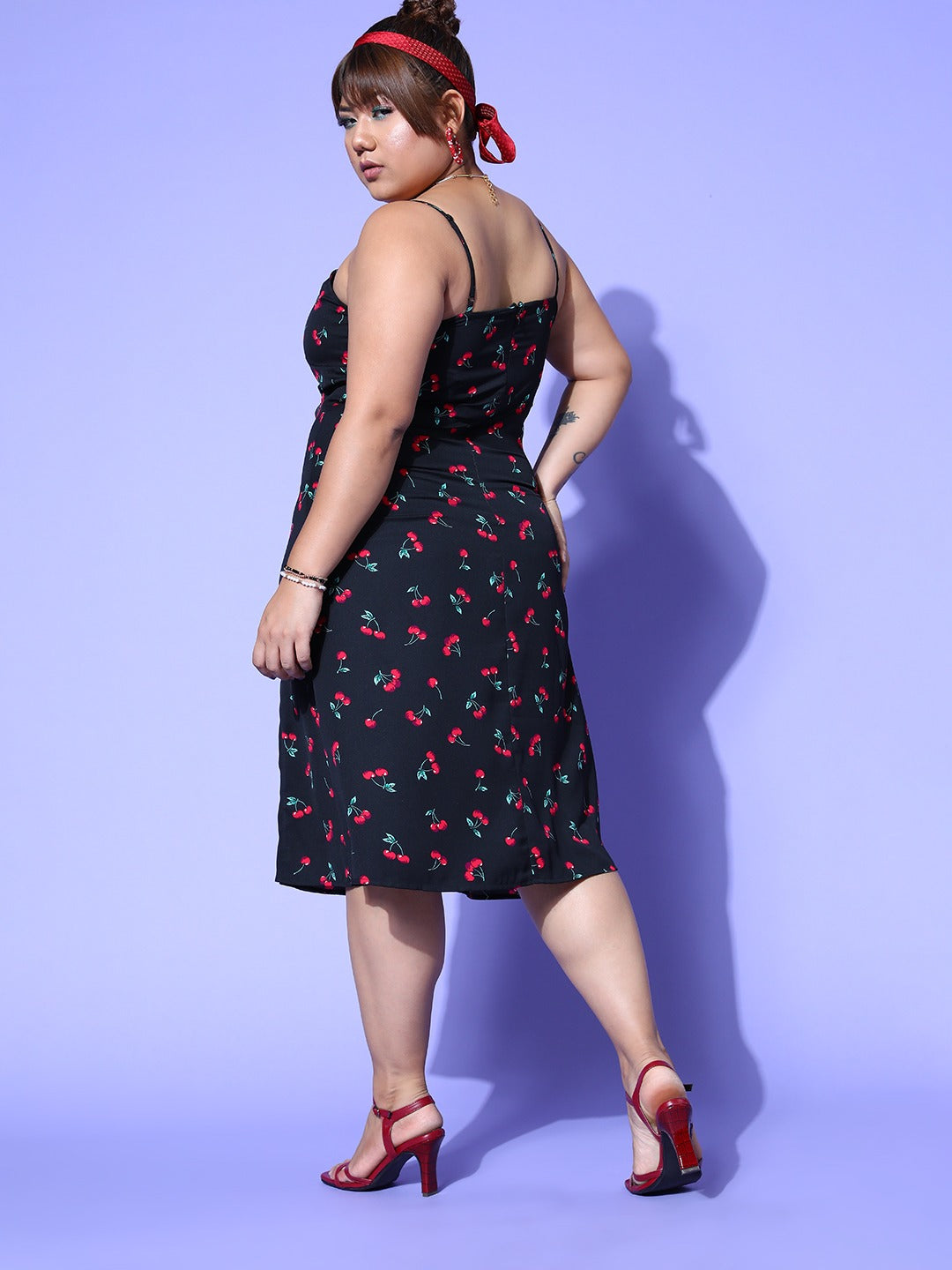 Berrylush Women Plus Size Navy Blue Cherry Printed Sweetheart Neck Ruched Sheath Midi Dress