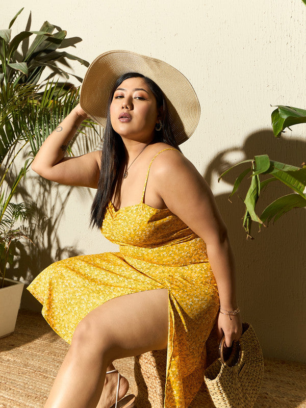 Berrylush Curve Women Yellow Floral Printed Sweetheart Neck Sleeveless Thigh-High Slit Straight Hem A-Line Midi Dress