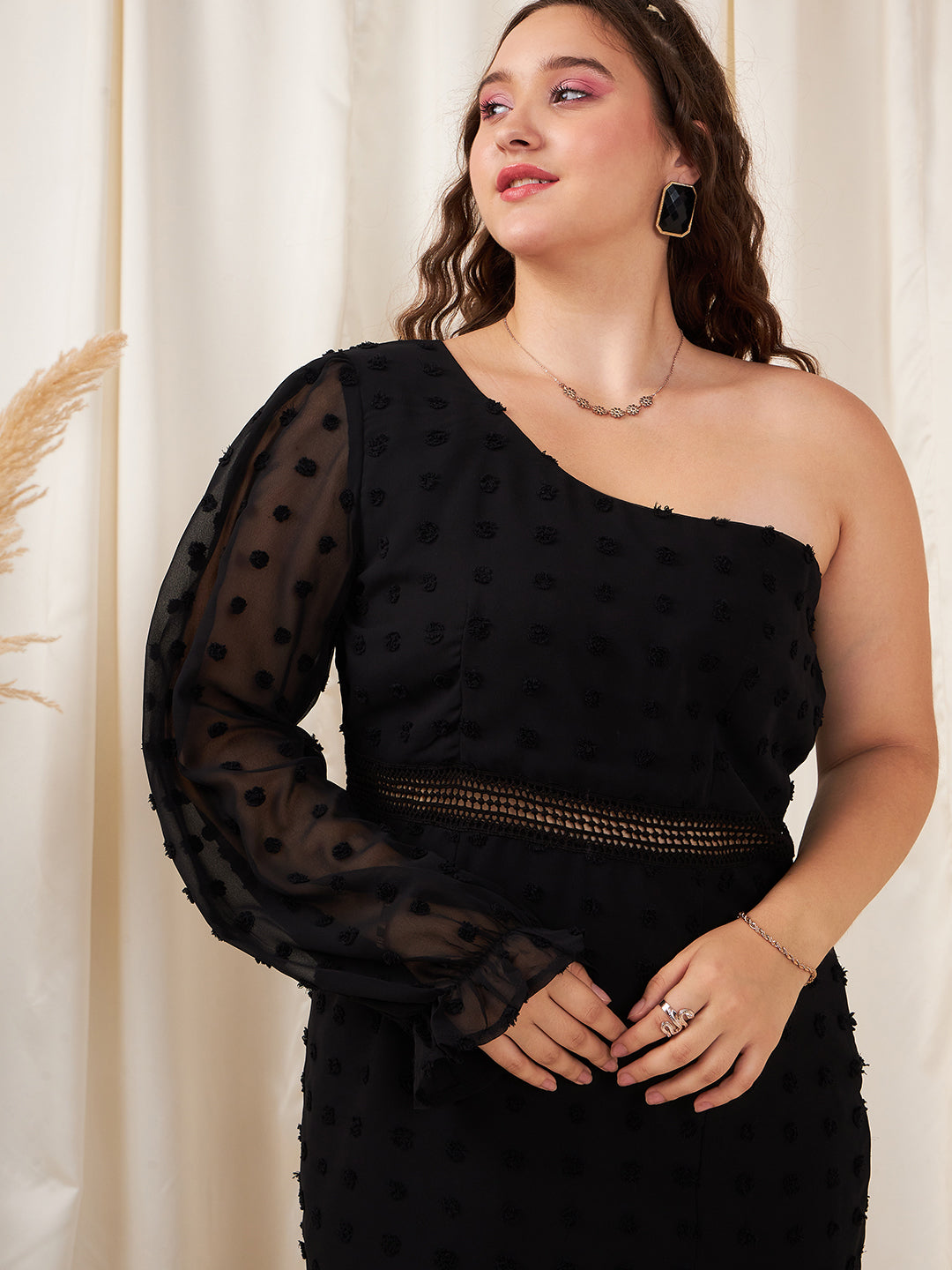 Berrylush Women Plus Size Solid Black Dobby Weave One-Shoulder Neck Semi-Sheer Jacquard Straight Hem Bodycon Mini Dress