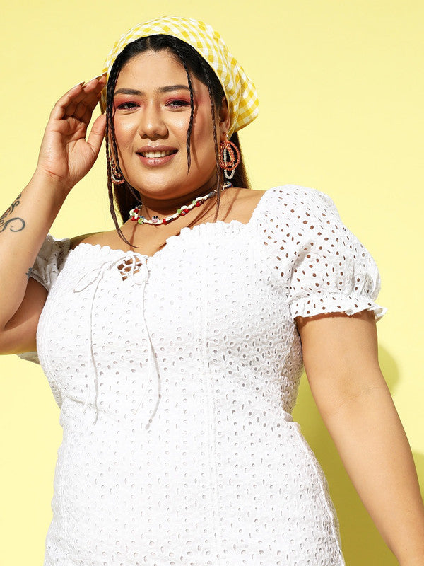 Berrylush Women Plus Size Solid White Sweetheart Neck Tie-Up Schiffli Flounce Hem Bodycon Mini Dress