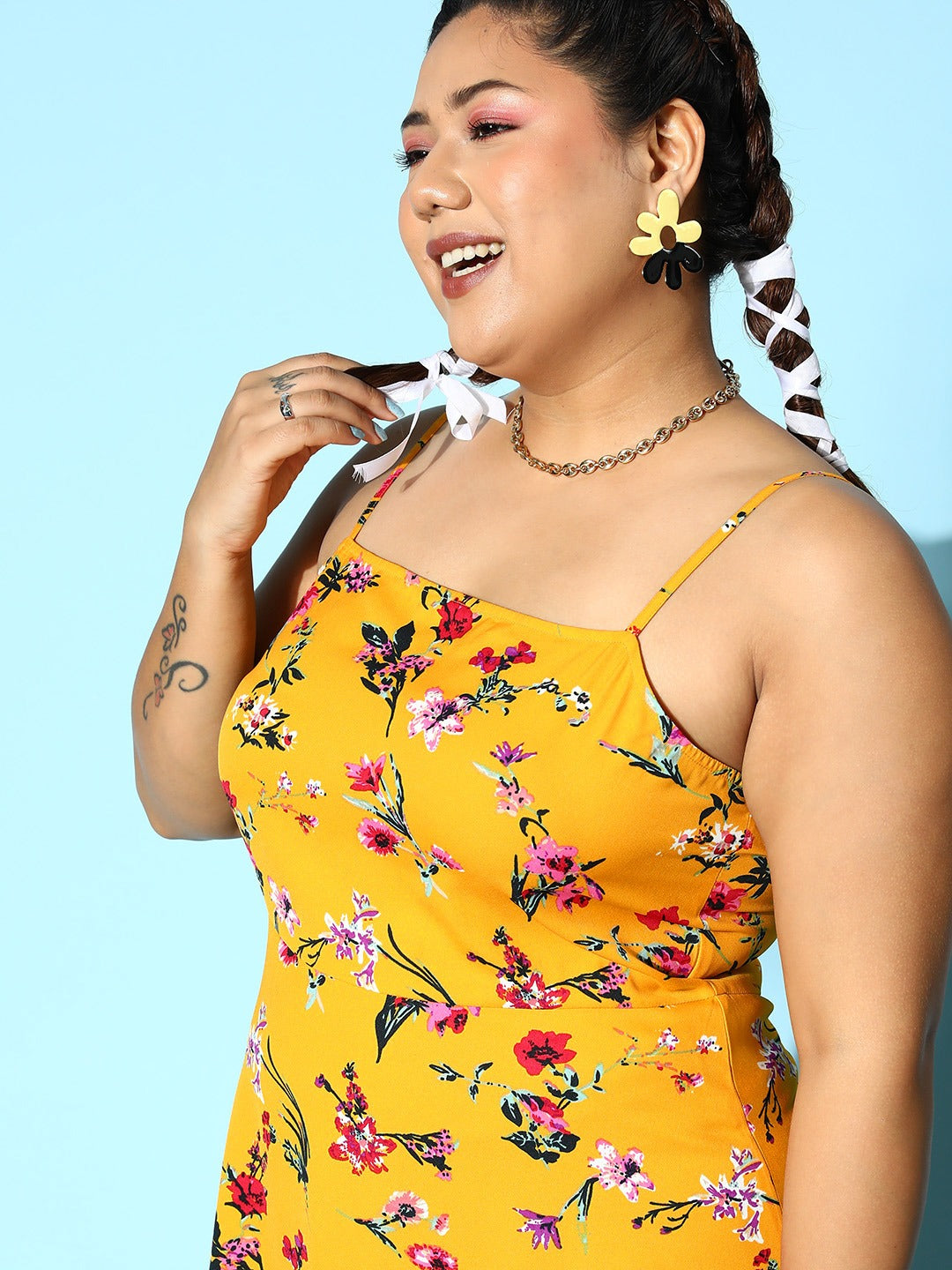 Berrylush Women Plus Size Yellow & Pink Floral Printed Square Neck Sleeveless Flared A-Line Mini Dress