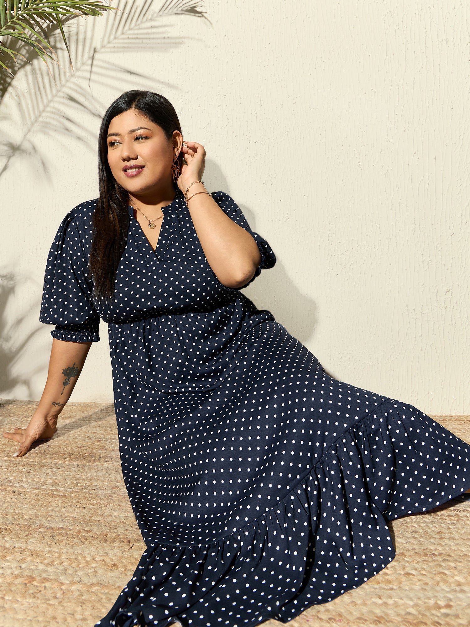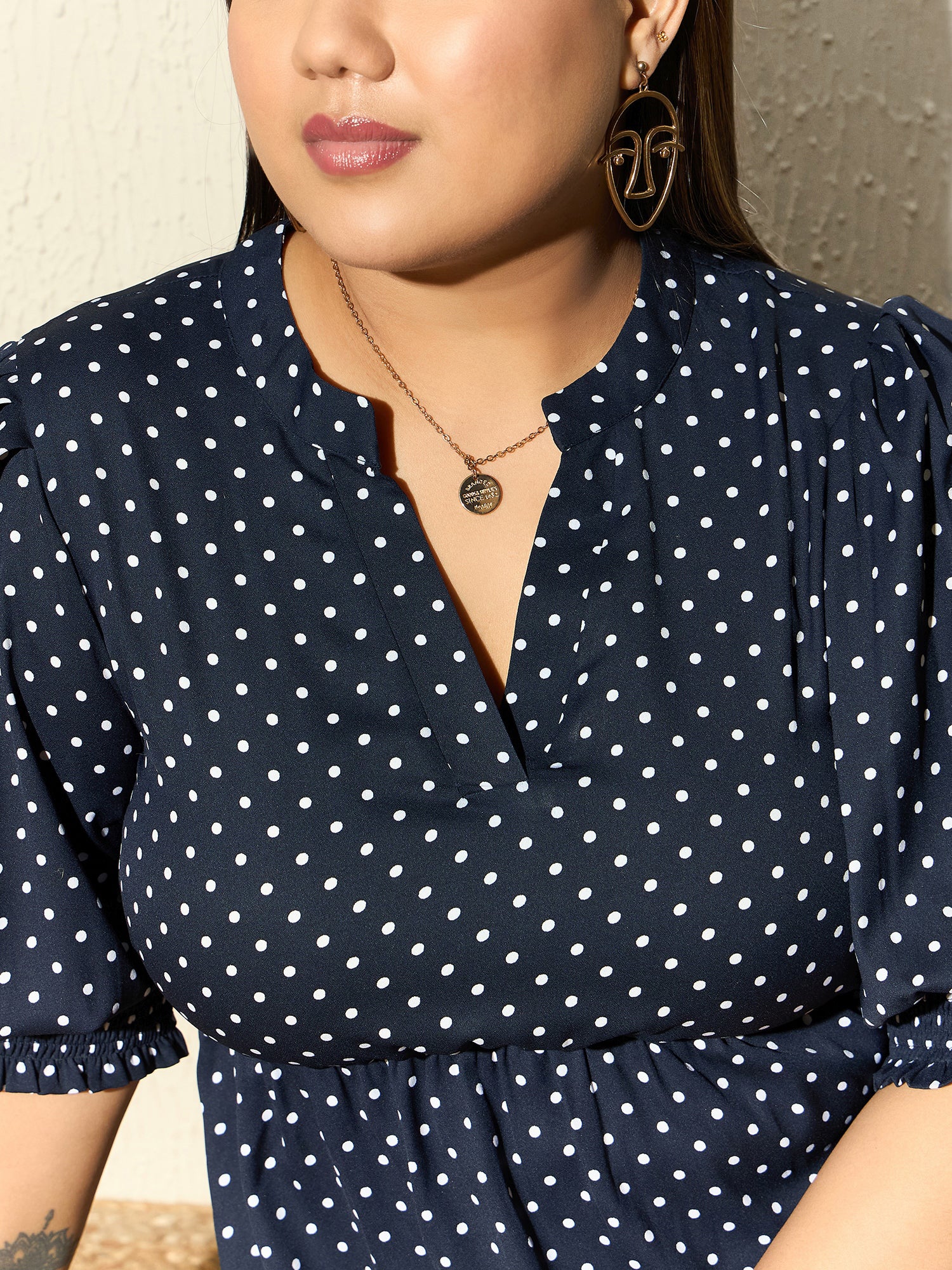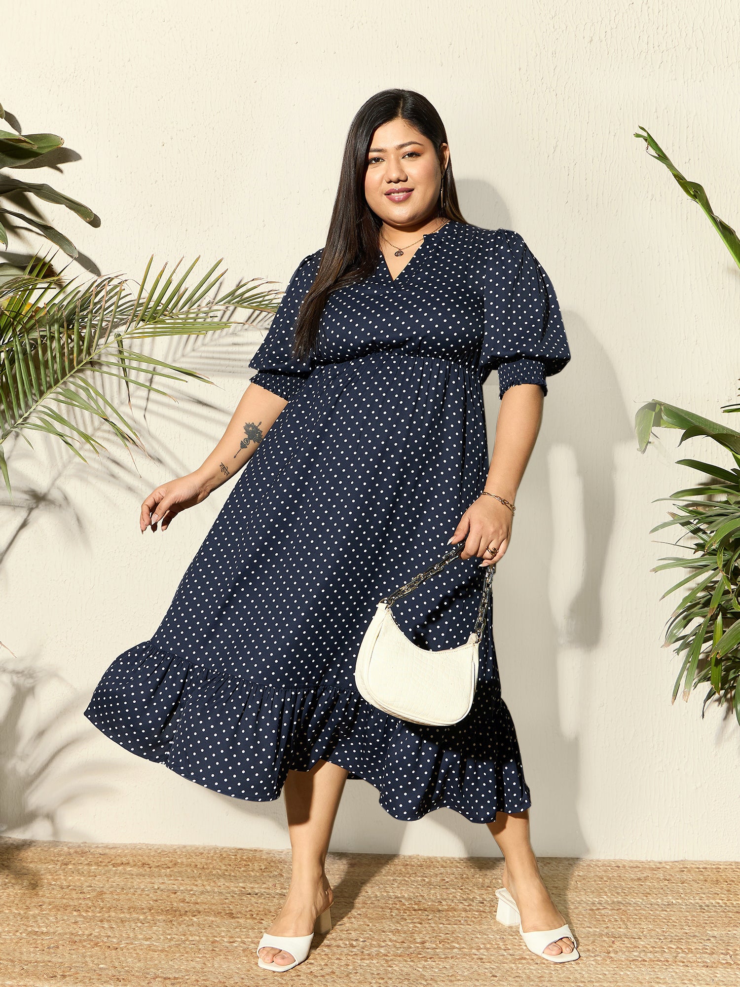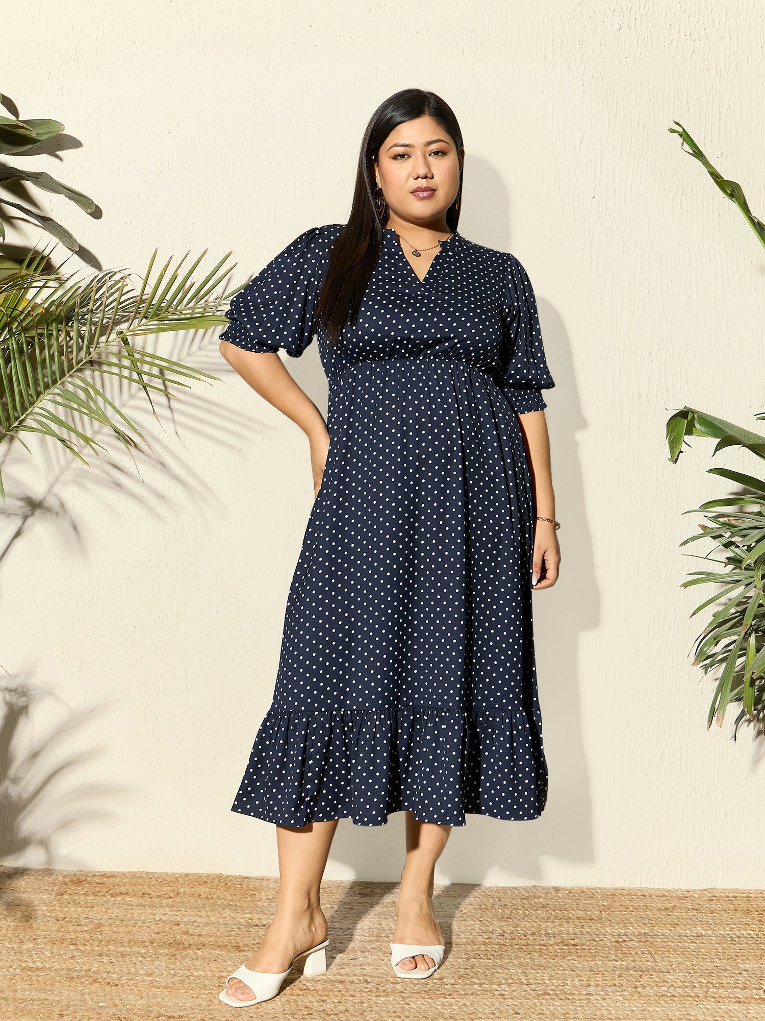 Step out in style with the Berrylush Curve Navy Blue & White Polka Dot Printed Midi Dress, where timeless elegance meets modern flair. Featuring a charming mandarin collar and playful puff sleeves that hit at three-quarter length, this dress is tailored for any casual outing. Crafted from smooth crepe fabric and adorned with crisp polka dots set against a deep navy background, it promises both comfort and sophistication. The fit-and-flare silhouette accentuates your curves while the pleated detailing adds texture to its appearance. Finished with a flouncy hemline for an extra touch of whimsy, this midi dress will ensure you're always dressed to impress.
