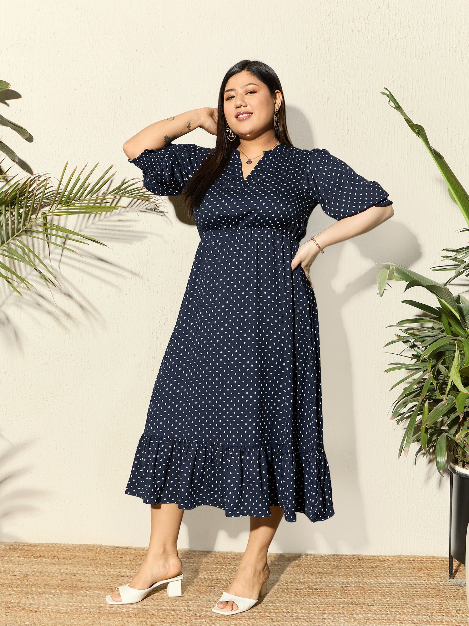 Berrylush Curve Women Navy Blue & White Polka Dot Printed Mandarin Collar Neck Crepe Pleated Fit & Flare Midi Dress