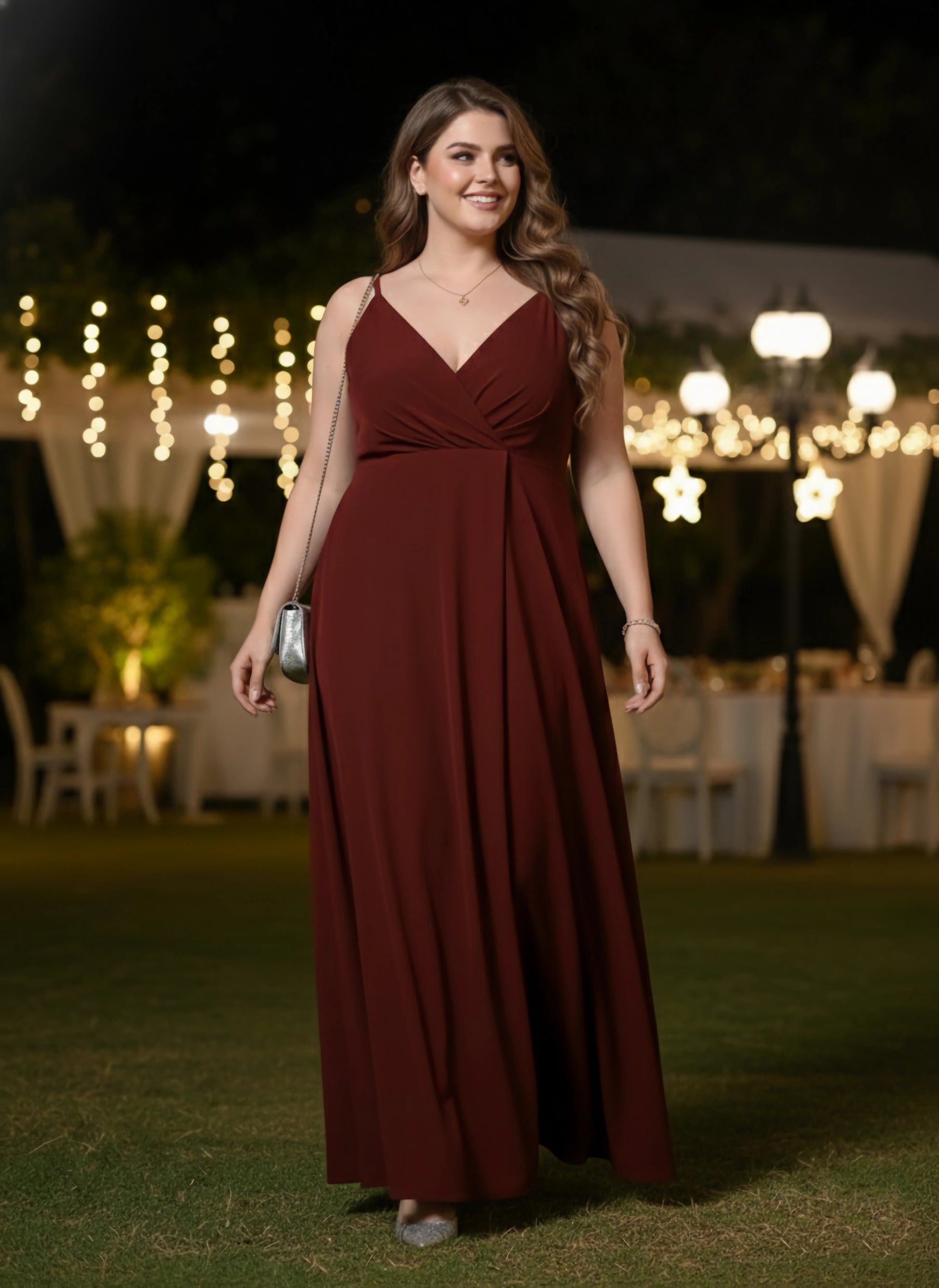 Embrace your love of elegance and sophisticated style with this splendid Solid Maroon V-Neck Sleeveless Thigh-High Slit Flared Maxi Dress designed by Berrylush. Fashioned with adjustable shoulder straps that give an alluring outline to your shoulders while reducing excess strain on your neck, back, and shoulders. The maxi length accompanied by flared hemline lends this dress a convenient style with flattering charm. That's not all, the sleeveless feature provides your arms with an exotic disclosure and hassle-free movements. Complete your look by wearing this maxi dress with a pair of block heels, cute earrings, and a stylish side bag.