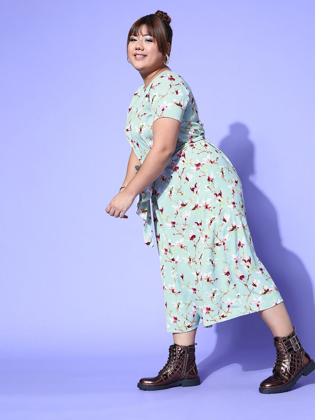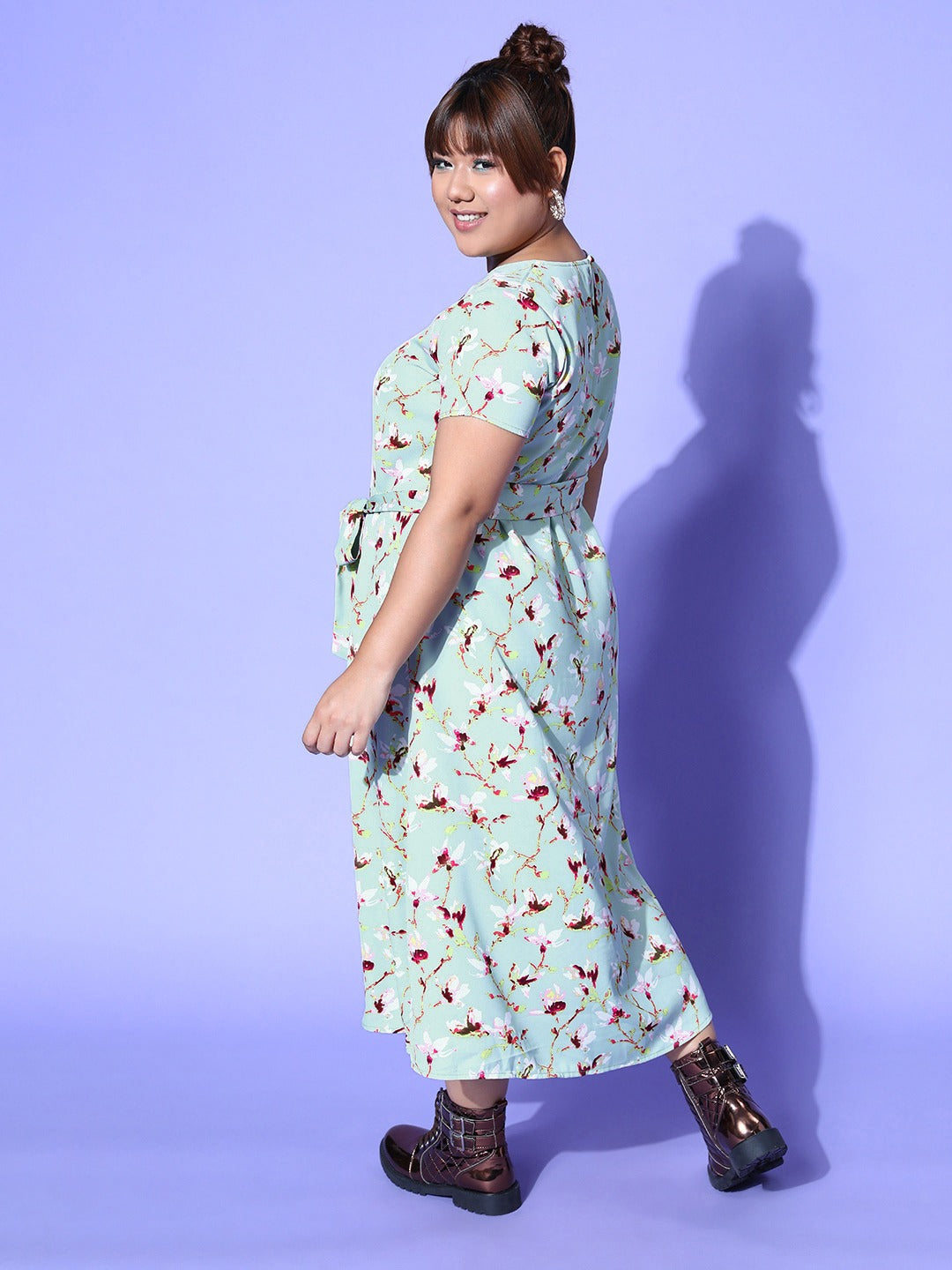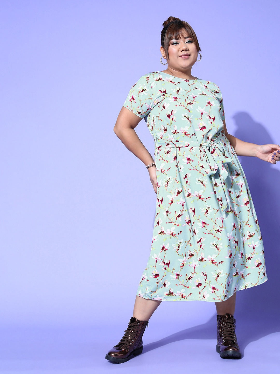 Berrylush Women Plus Size Grey Floral Printed Round Neck Waist Tie-Up Flared A-Line Midi Dress
