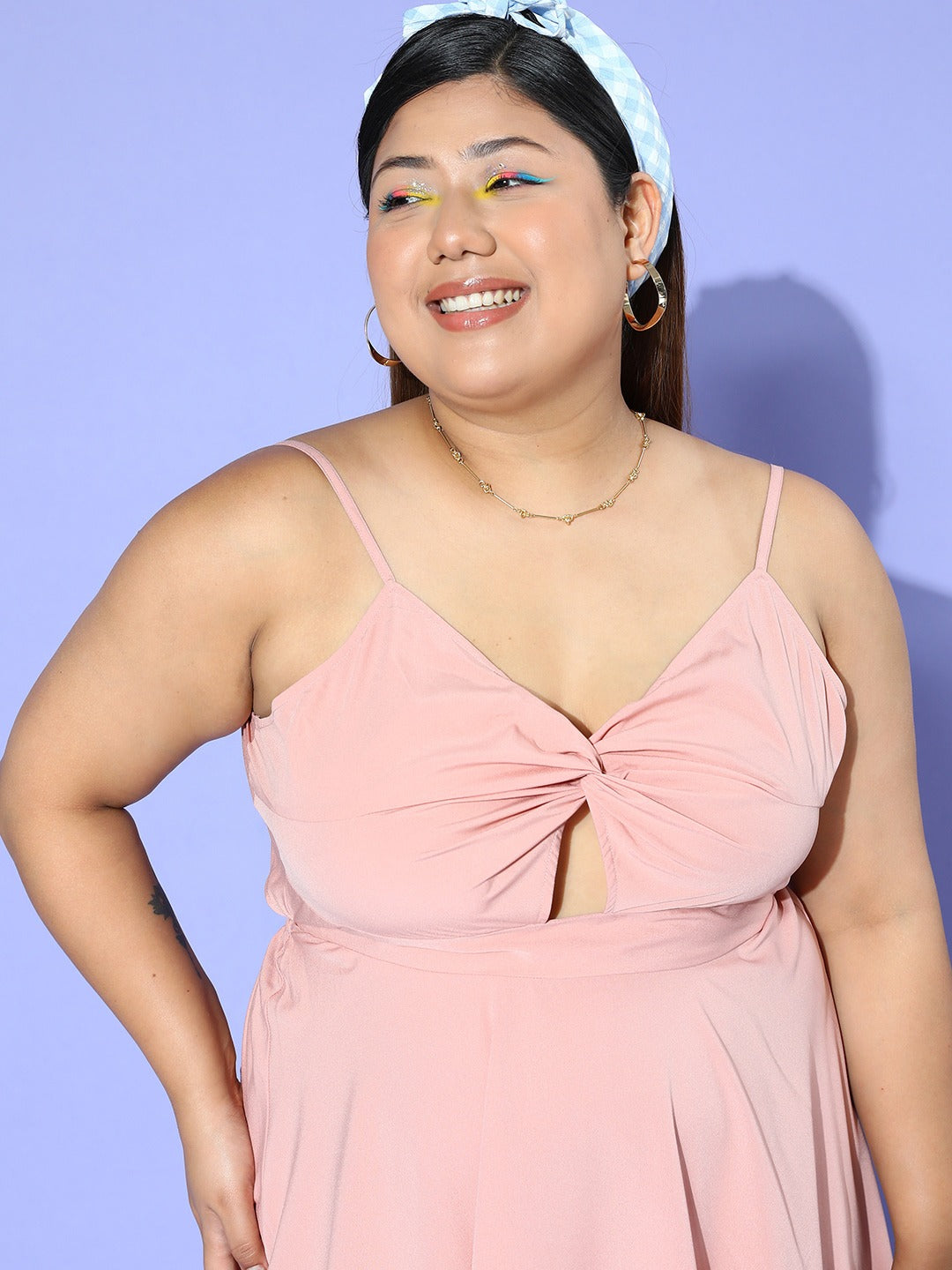 Look dazzling and get into party mode with this alluring Solid Light Pink V-Neck Front Cutout Twisted Knot Fit & Flare Mini Dress from Berrylush. It is delicately designed from polyester fabric to make it lightweight and attractive at the same time. The light pink colour of the dress looks captivating with a solid pattern as it presents a luxurious formula for party events. The V-neck finish gives an alluring appeal to your neckline while the sleeveless design complemented with shoulder straps gives attraction to your arms. The mini length and cutout surface styling give the dress a dynamic look. Complete your look by pairing this mini dress with your favourite high-heels and a silver clutch.