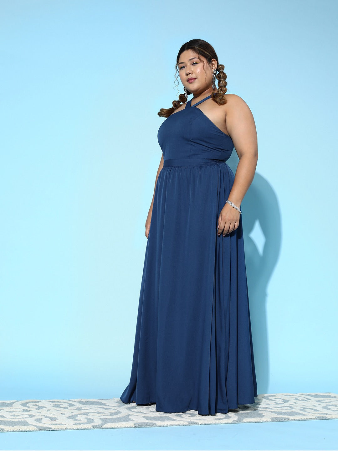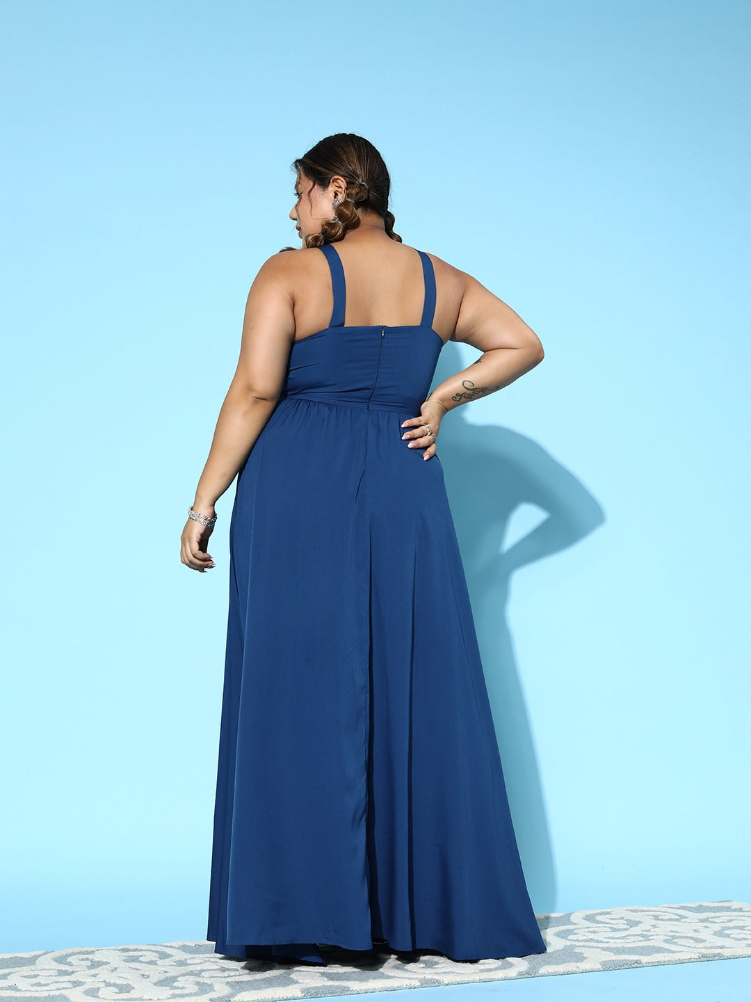 - The blue colour and a solid pattern add a charming flair to this maxi dress