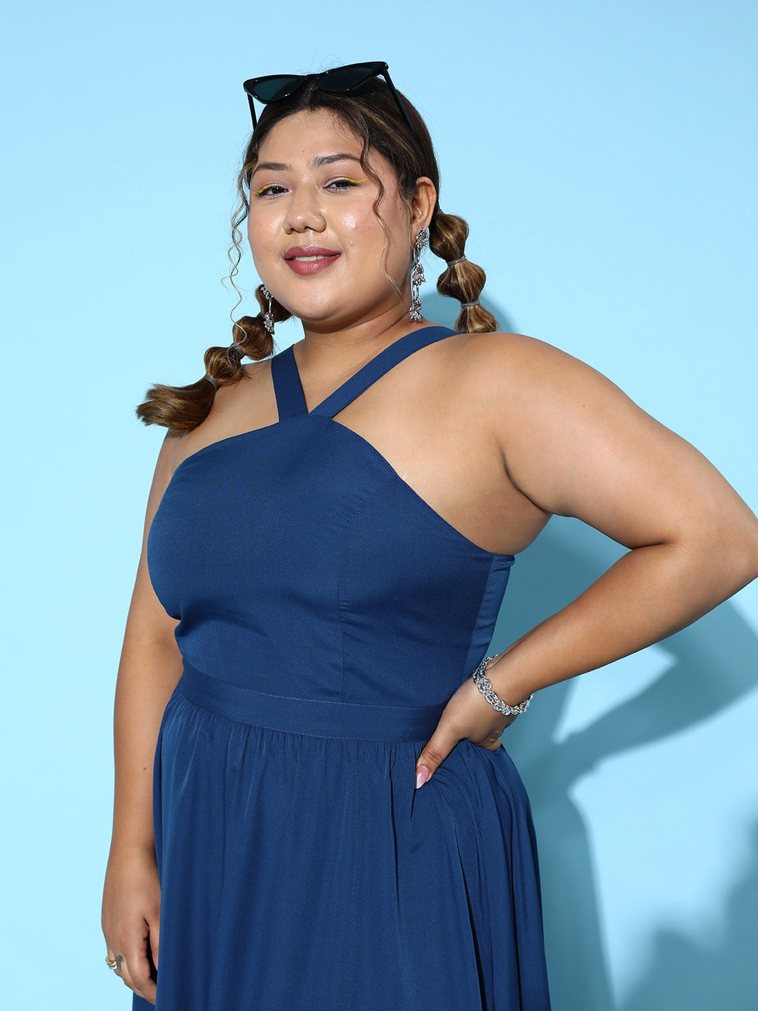 The significance of elegance and style lies specifically in the charming amalgam of creative ideas just like this gorgeous Solid Blue Halter Neck Sleeveless Zipper-Up Pleated A-Line Maxi Dress from Berrylush. Flaunting a beautiful duo of blue shade and solid pattern that adjoins a hint of royalty to this dress and makes your look appear classier. Elegantly designed in an A-line shape that draws attention towards the waist for a curve-hugging silhouette. Moreover, the flared hemline boosts the overall charm of this dress by injecting additional flair and ruffle. Rock the home party by uplifting the mood by pairing this tiered A-line dress with shimmery block heels, tassel earrings, and a chic round bag.