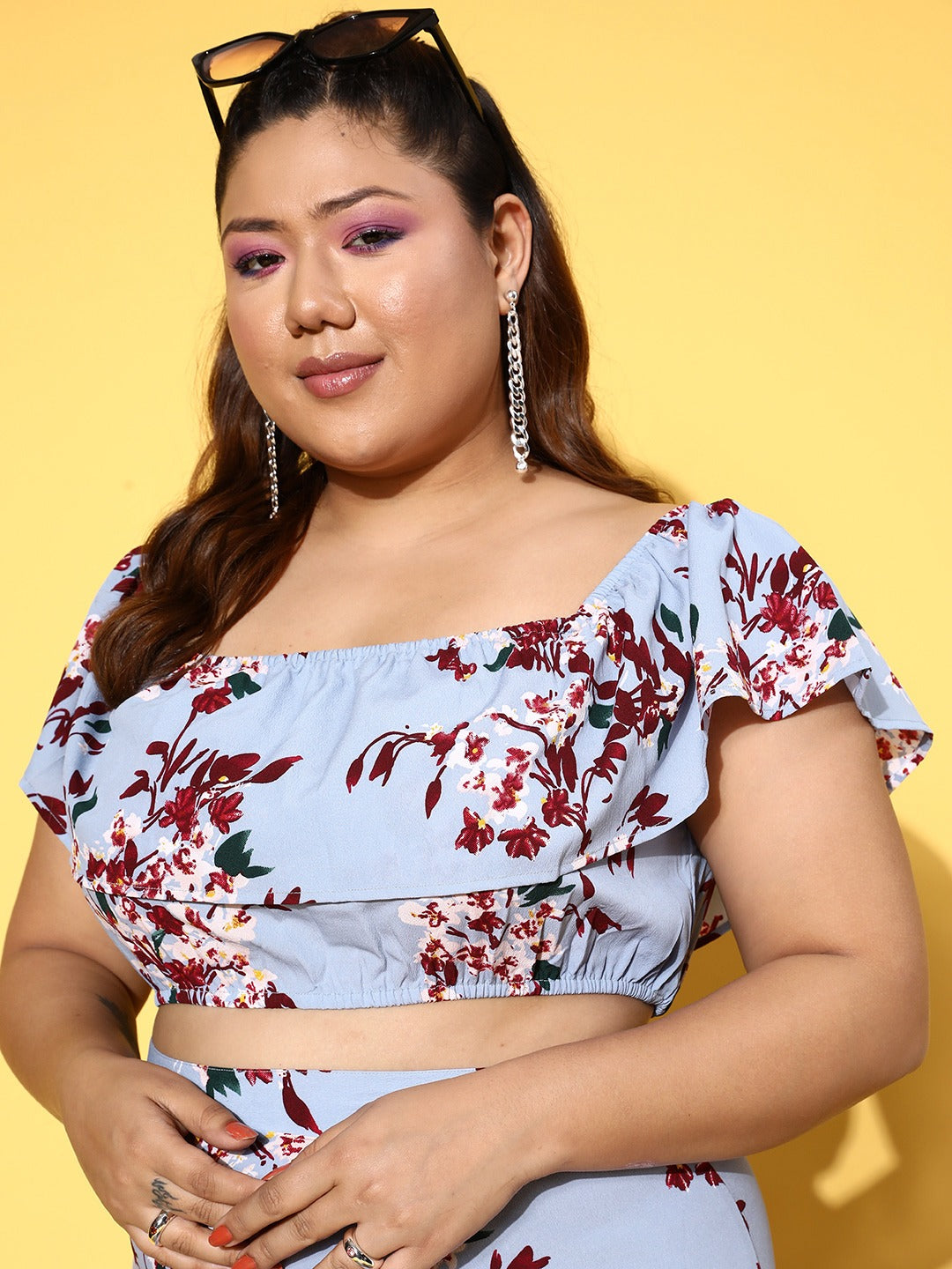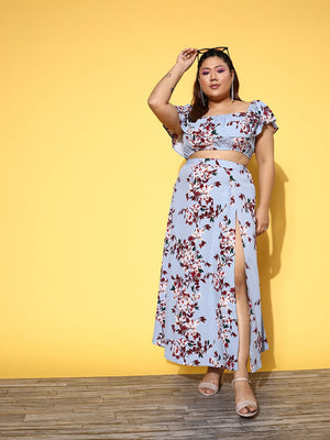 Berrylush Women Plus Size Blue & Maroon Floral Printed Off-Shoulder Neck Cropped Top & Thigh-High Slit Maxi Skirt Co-Ord Set