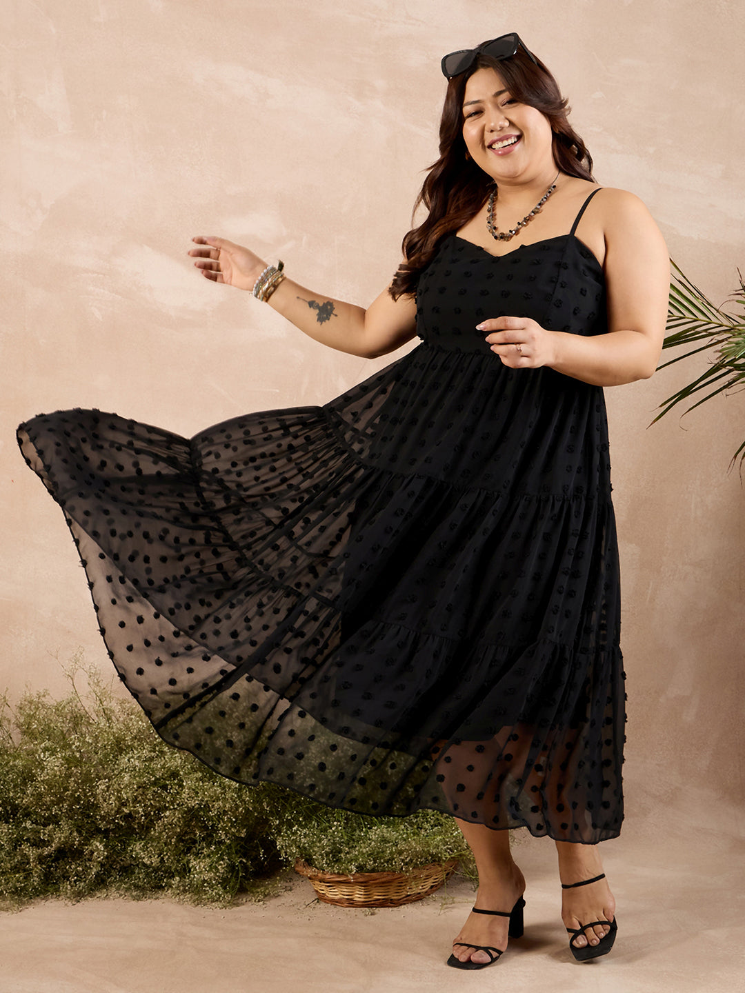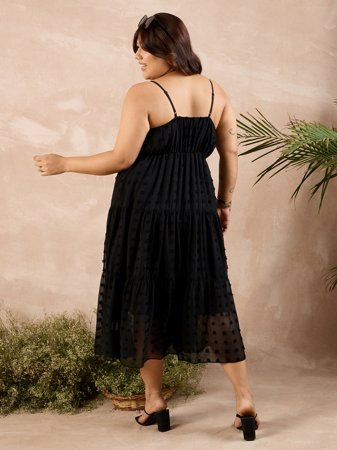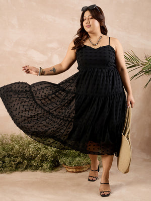 Berrylush Curve Women Solid Black Dobby Weave Sweetheart Neck Sleeveless Pleated Fit & Flare Midi Dress