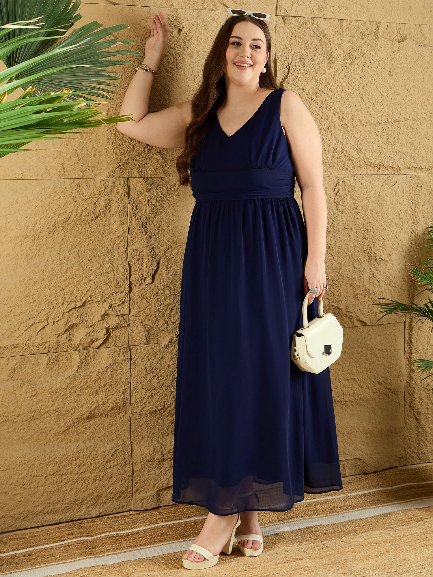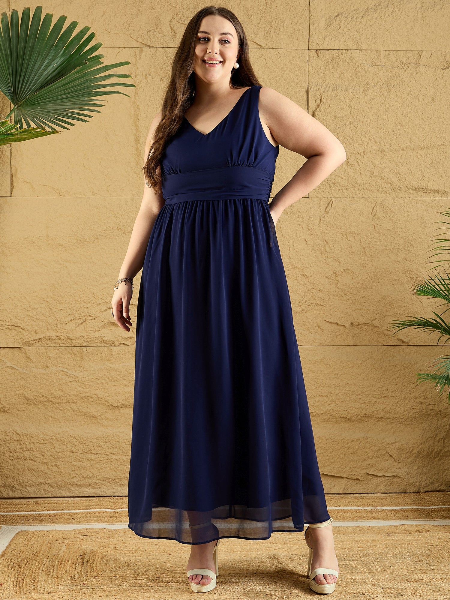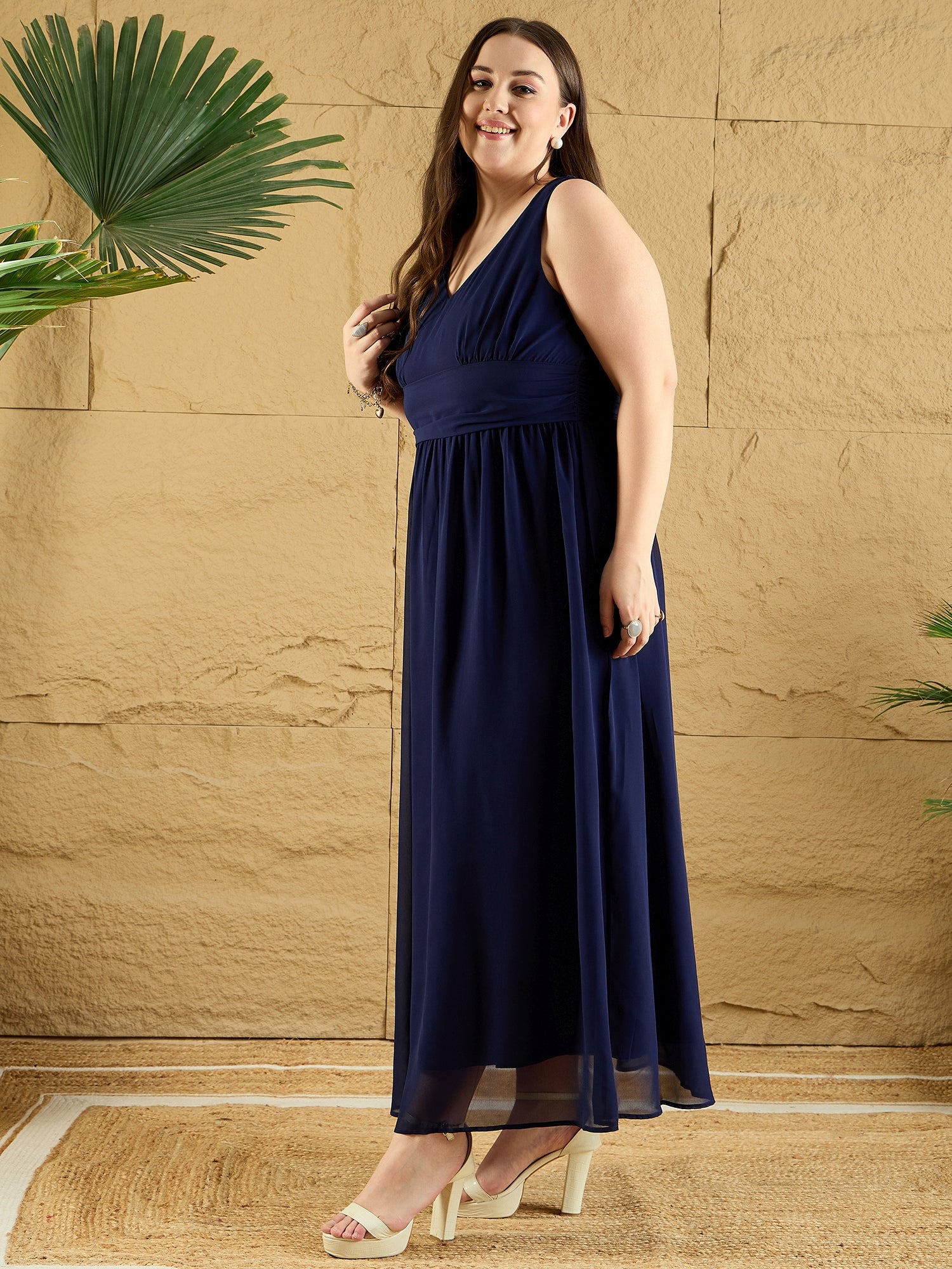 Berrylush Curve Women Solid Navy Blue V-Neck Sleeveless Back Concealed Zipper-Up Pleated A-Line Maxi Dress
