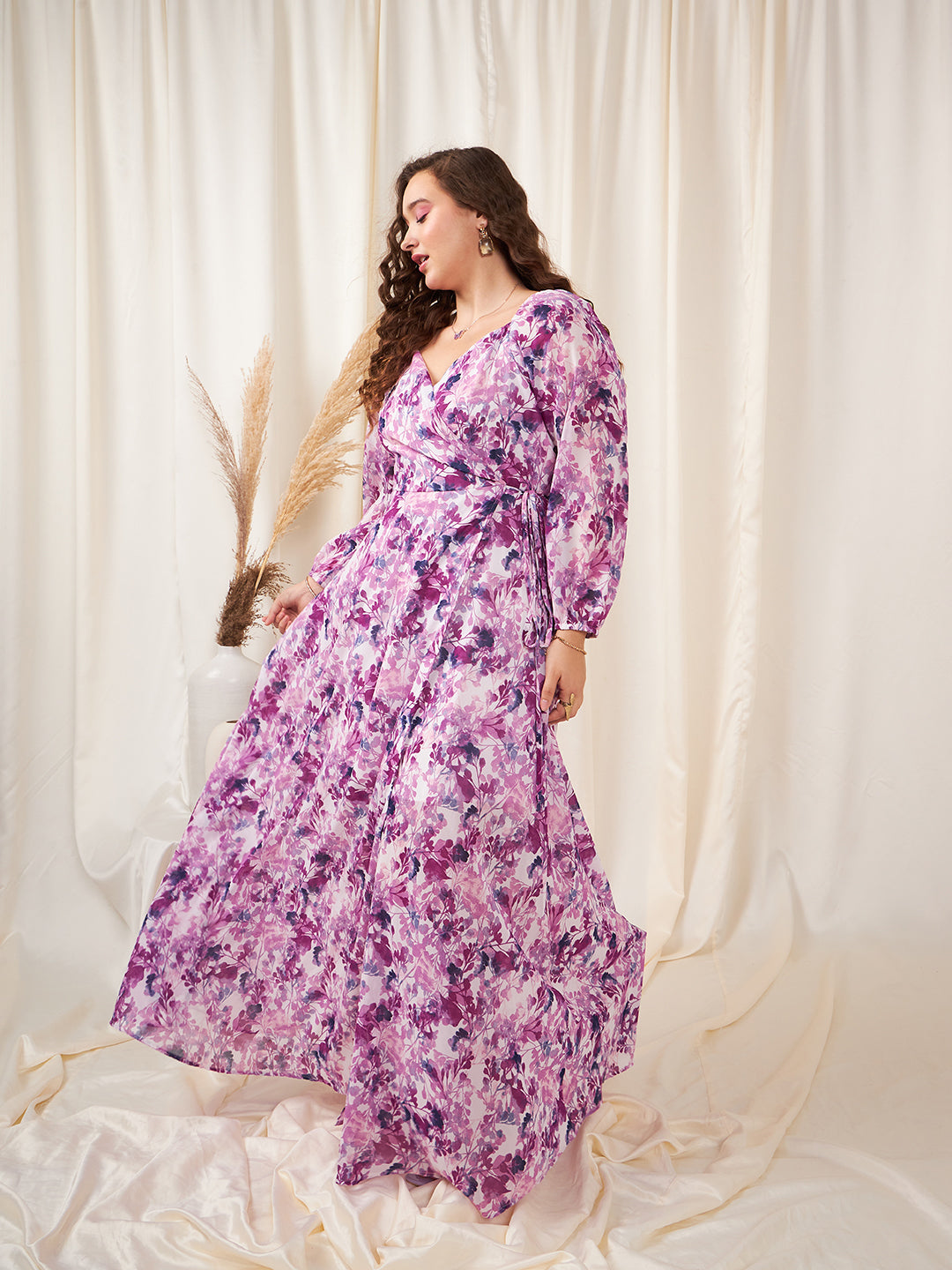 Berrylush Women Plus Size White, Purple, & Navy Blue Floral Printed Sweetheart Neck Waist Tie-Up Georgette Pleated Wrap Maxi Dress