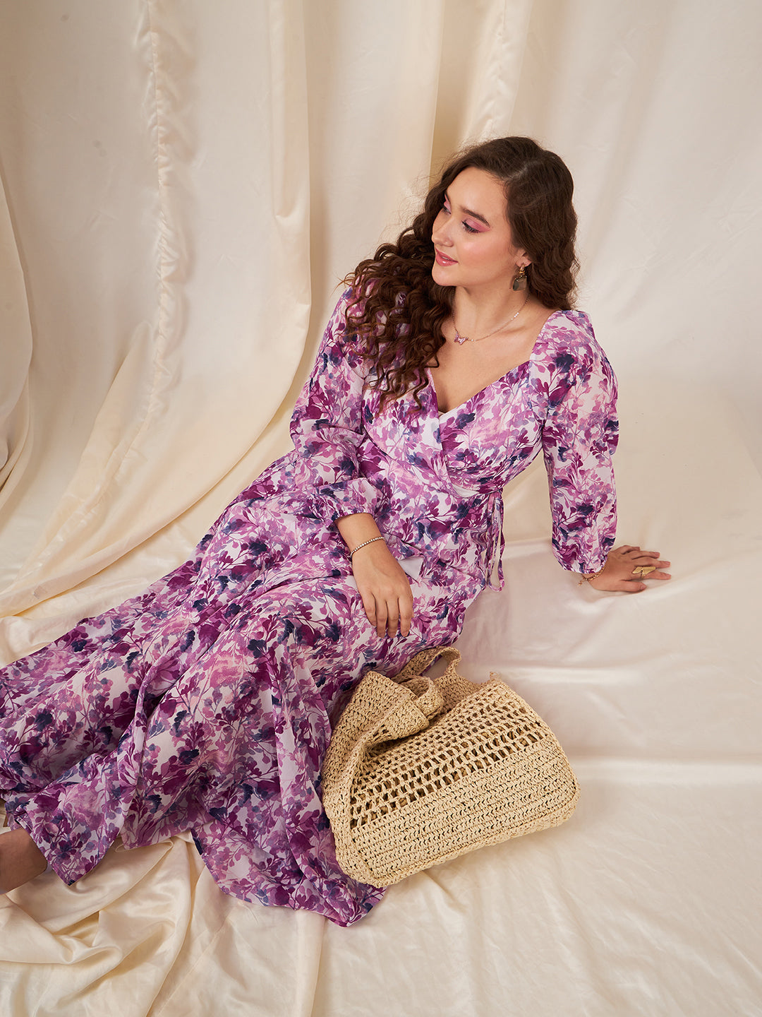 Introducing Berrylush's White, Purple, & Navy Blue Floral Printed Sweetheart Neck Waist Tie-Up Georgette Pleated Wrap Maxi Dress - your ultimate style beacon. This enchanting dress blooms in refreshing shades of white, purple, and navy blue; an exclusive print to captivate and impress. Featuring a flirtatious sweetheart neckline flowing into long regular sleeves - as comfortable as it’s chic! The garment boasts a maxi length with an enticing flared hemline for added allure. Purposefully spun from pure polyester georgette fabric exhibiting knitted weave detail - offering unrivalled durability without compromising on comfort or quality. It balances beauty with convenience featuring practical details like the concealed zipper and tie-up closure complemented by intricate pleats - a masterclass in detailing! Perfectly opaque with lined interior securing optimum coverage - for casual encounters designed to be remembered. Let yourself shine brighter than ever before - with Berrylush.