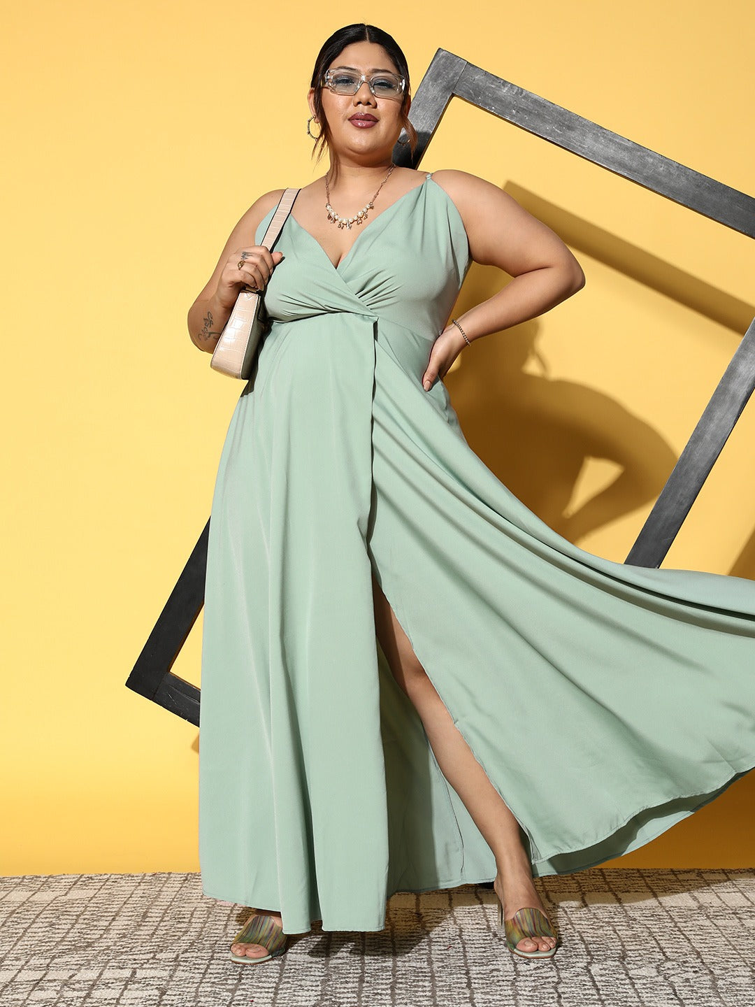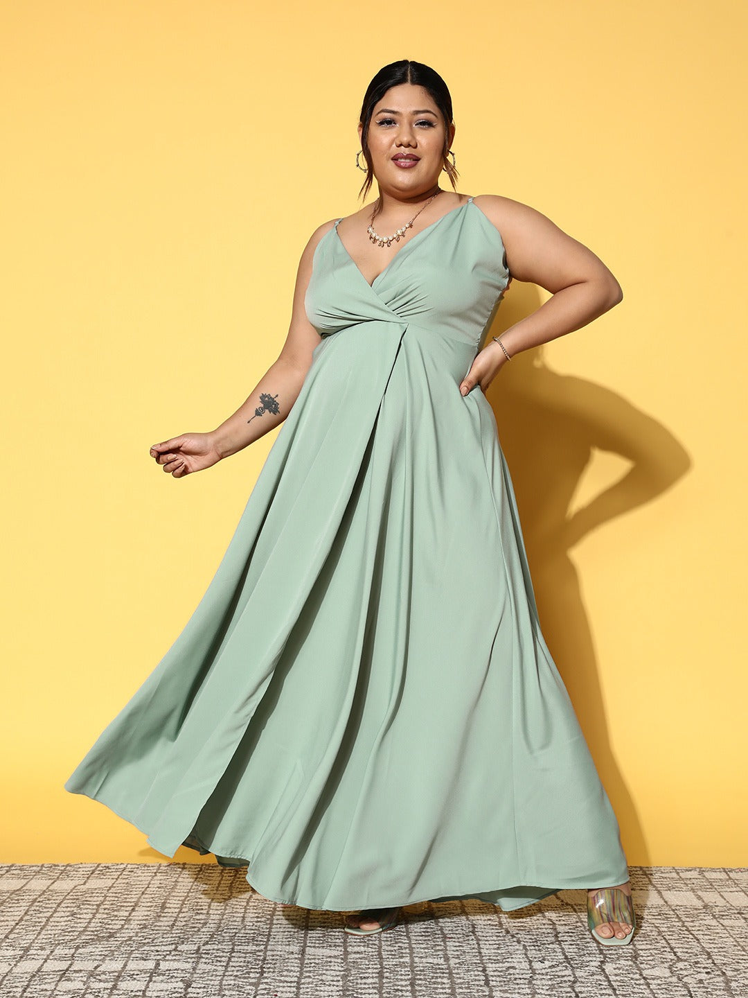 Berrylush Women Plus Size Solid Green V-Neck Sleeveless Crepe Thigh-High Slit Flared Maxi Dress