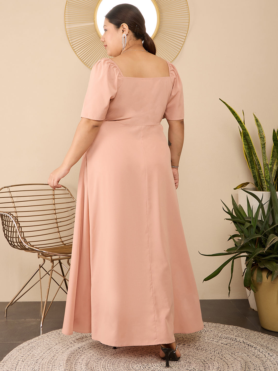Berrylush Curve Women Solid Pink Square Neck Puff Sleeves Thigh-High Slit Flared Maxi Dress