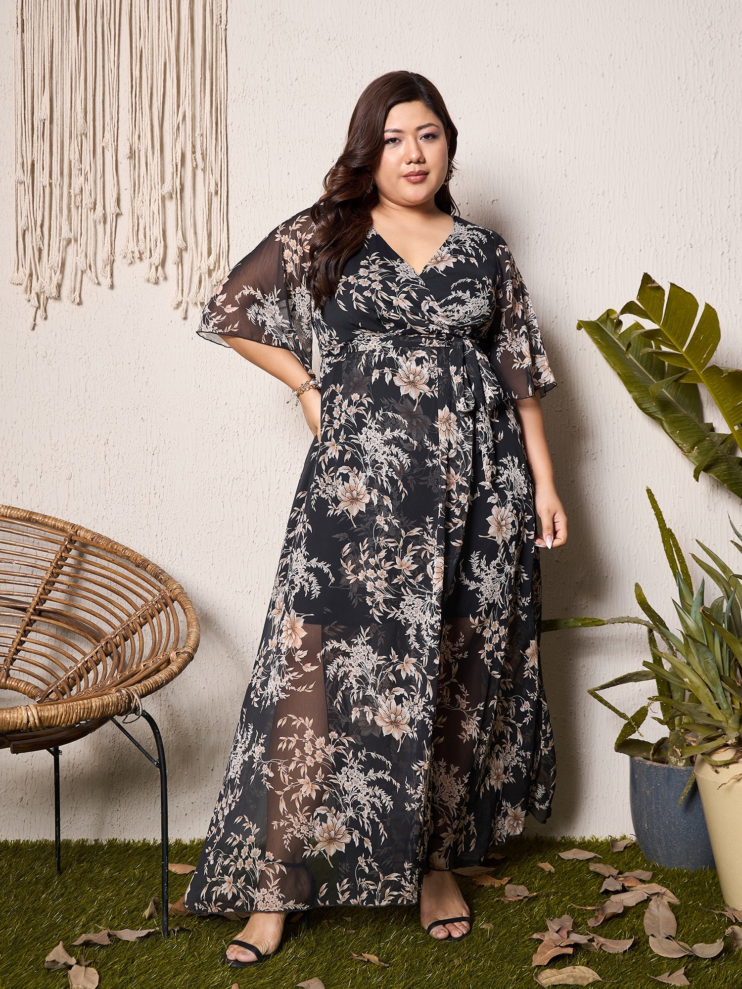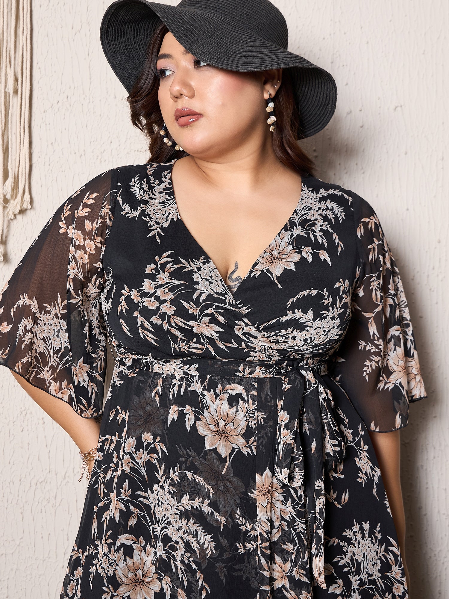 Berrylush Curve Women Black & White Floral Printed V-Neck Flutter Sleeves Waist Tie-Up Thigh-High Slit Flared Maxi Dress