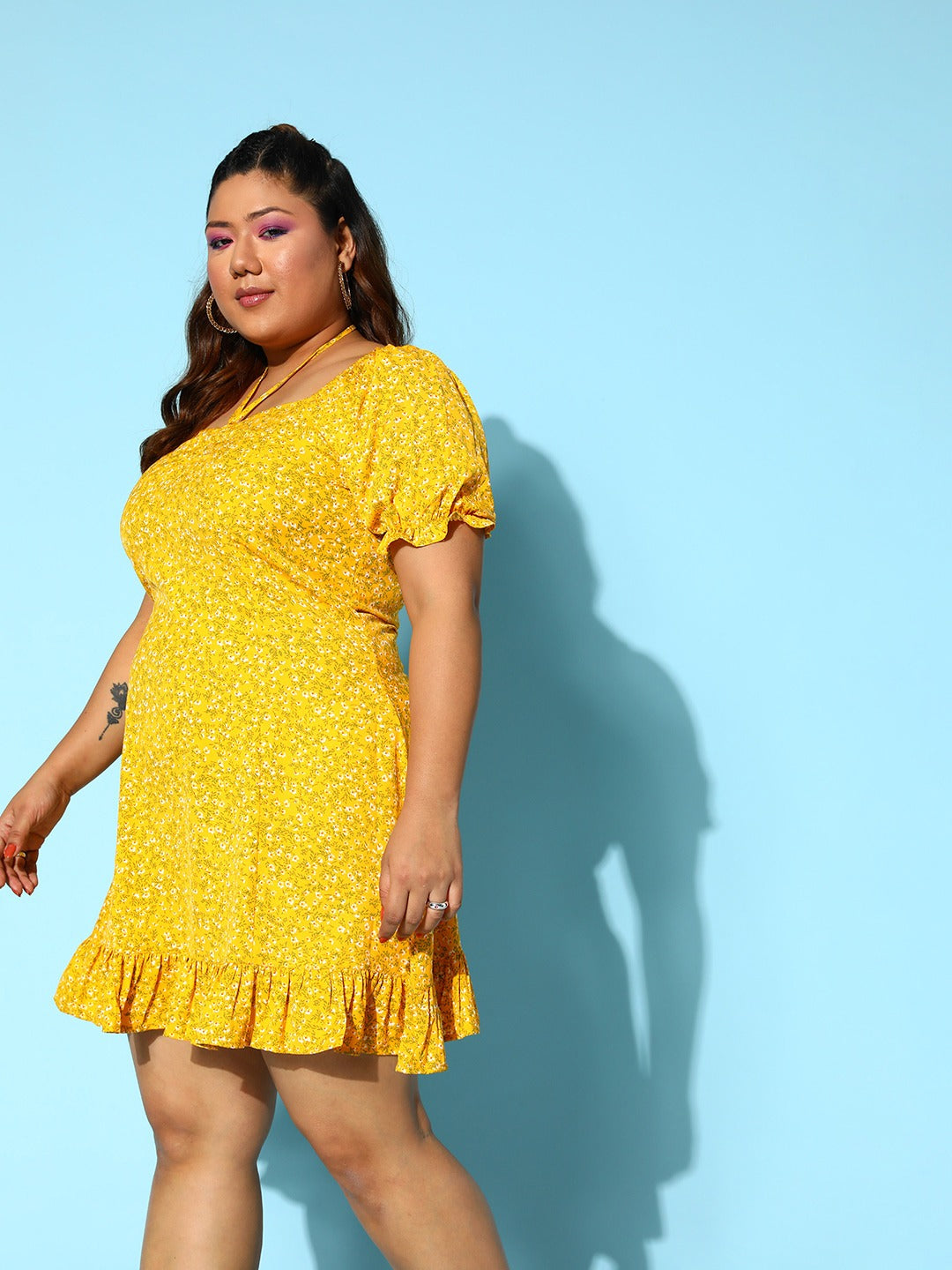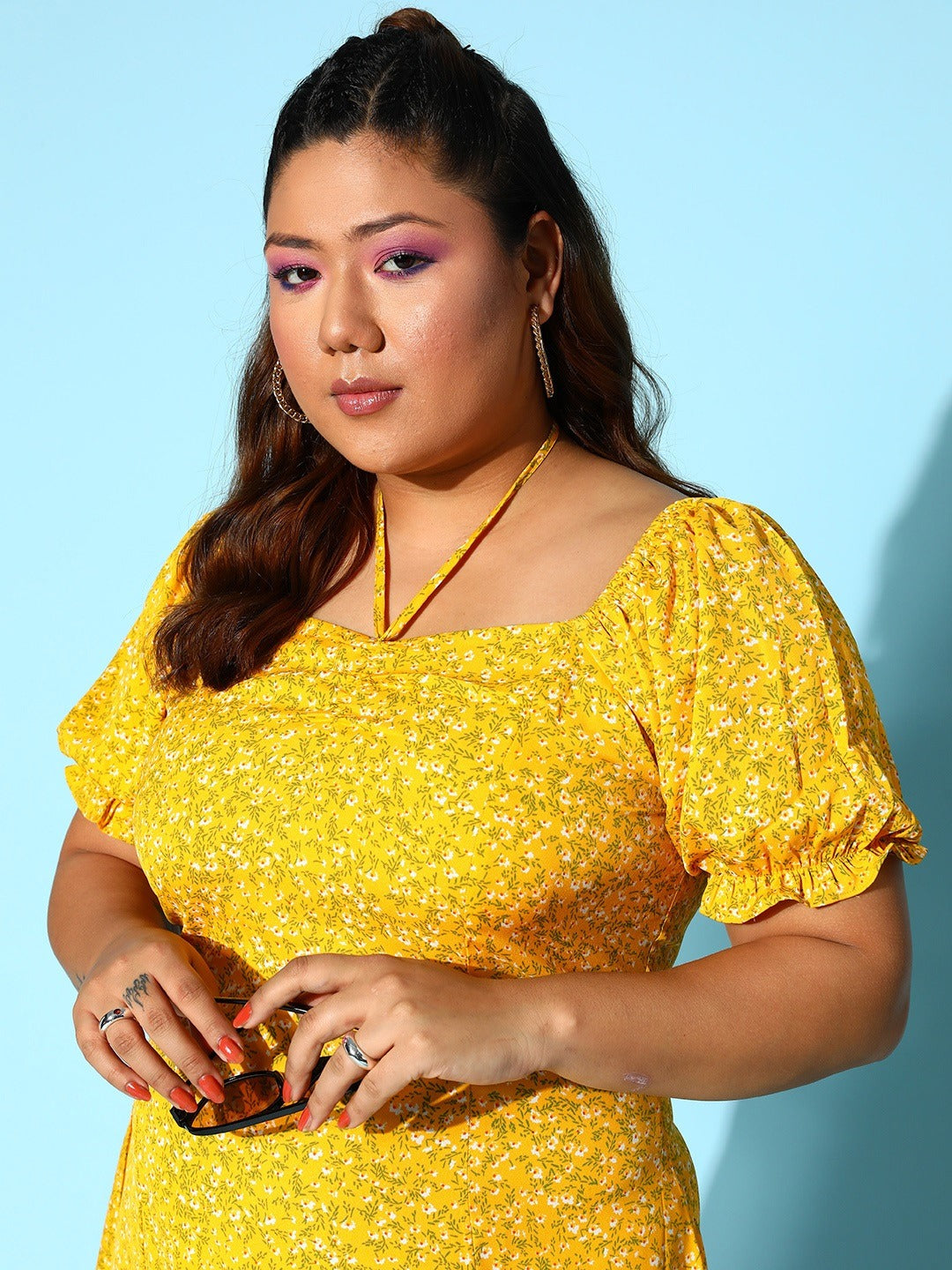 Berrylush Women Plus Size Yellow Floral Printed Square Neck Tie-Up Back Crepe Flared A-Line Maxi Dress